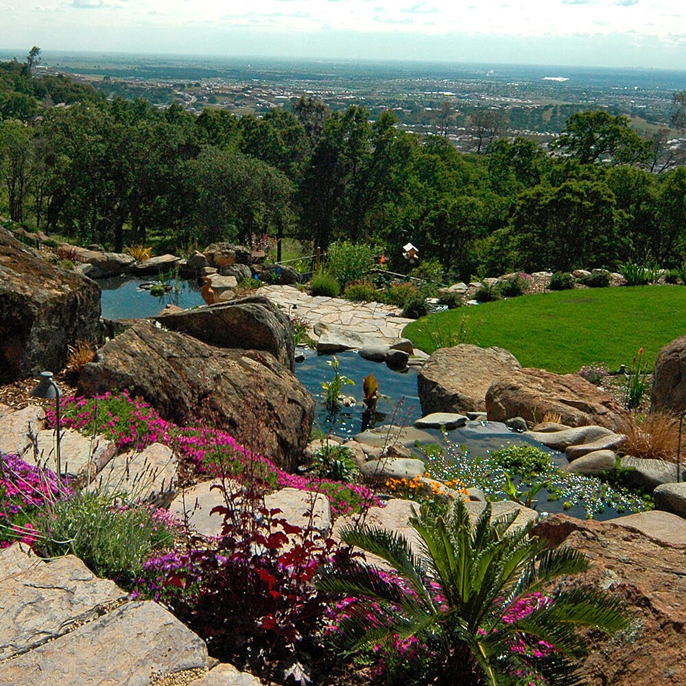 Winding from the south end of the pool, two giant ponds resembling artisan wells, and filled with almost 10,000 gallons of water, stay connected via a tumbling stream of rills and rivulets. Taylor stocked the ponds with 30 koi imported from an award-winning breeder in Japan. “In the beginning, I lost a few of the fish to a large Blue Heron. I remember watching helplessly as he would swoop in and pluck the fish like taking candy from a jar. He was successful when they were smaller, but now the koi are one- to two-feet long.” Water-worn rocks, hand-selected from a nearby seasonal streambed, were placed along the stream’s edge, making the entire water garden look as if it had been there for thousands of years. “Installing the plumbing for the water garden was interesting,” Taylor chuckles as he recalls brainstorming with architect Allison on ways to navigate the underground piping around the giant rocks and slope.
