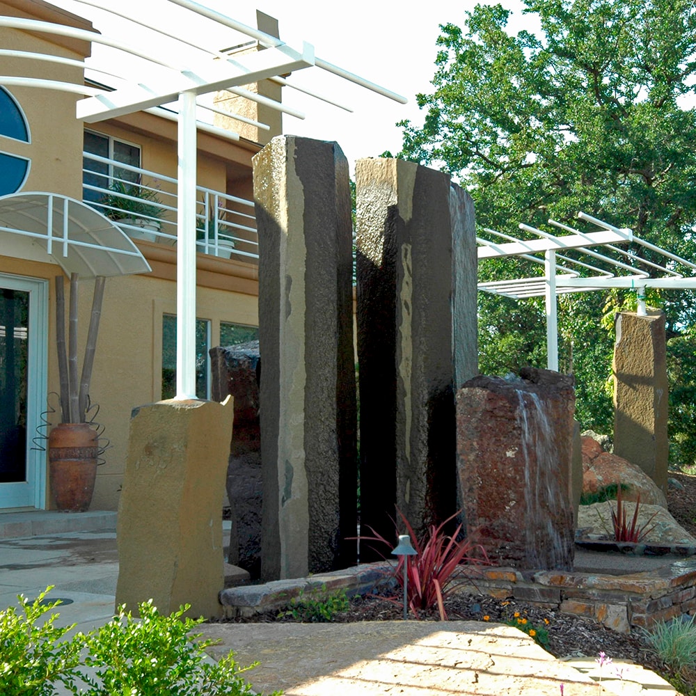 500-million-year-old volcanic rocks from the Moses Lake area of eastern Washington erected as a massive water feature and anchor for the wisteria garden at the entrance to the home.