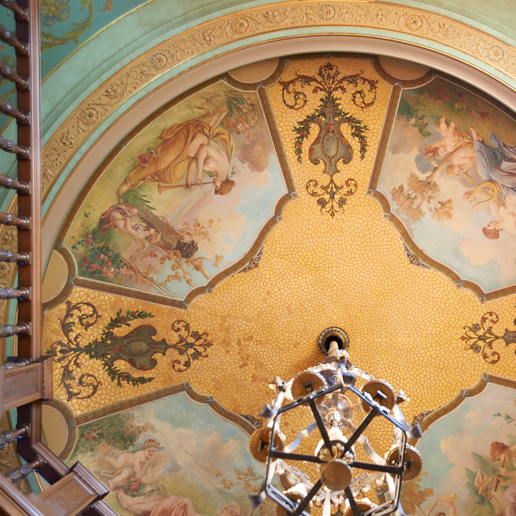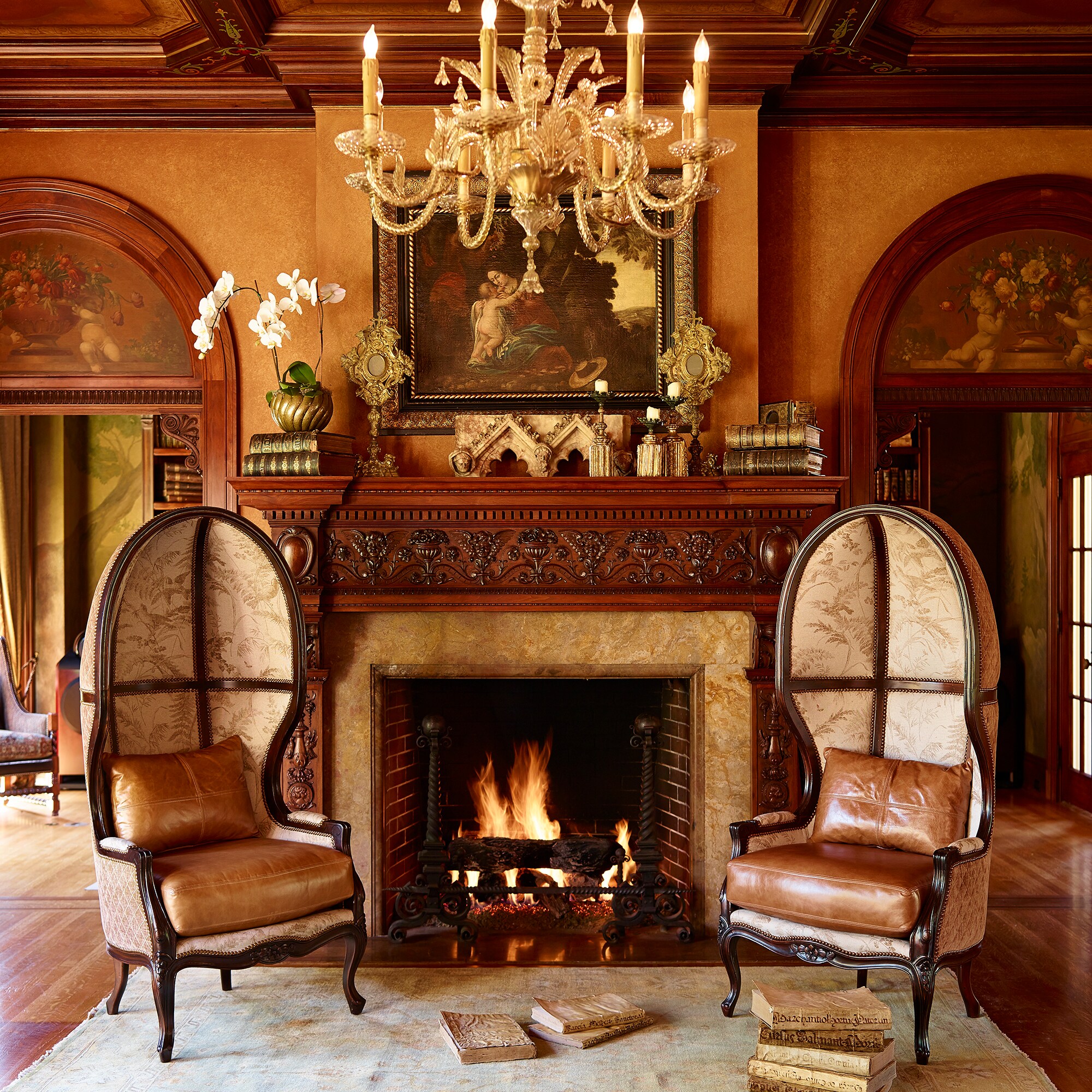 Cross the threshold, and you immediately understand her reaction. Exuding museum-like detail, archway after archway opens onto rooms detailed with rich walnut panels, hand-stenciled beams and intricate stained glass. Most remarkable are the exquisite murals by renowned Dutch artist Anthony Heinsbergen.