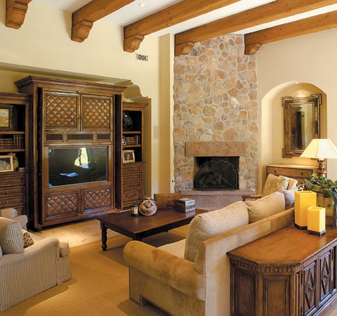 Here’s what Ron and Daron knew for sure: they wanted their home to exude a warm, friendly feeling. The house itself was intentionally aged to resemble a centuries-old villa in rural France or Italy. Exterior columns were sandblasted, canterra-stone fireplaces tinted, and doors stained and distressed. Taking his cue from this architectural style and mindful of Ron and Daron’s preferences, David recommended floors of white oak and rustic Mexican sandstone, countertops of honed granite and polished marble, interior doors and trim milled from tight-knot alder — and lots of texture.