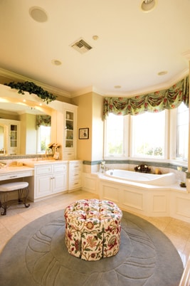 The luxurious master bath features a walk-in shower and a generously sized tub surrounded by windows. Browse our Bathroom Accessories to create the perfect setting for a relaxing, invigorating soak.