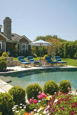 To highlight the new hardscaping, the couple consulted landscape architects Gregg Toland and Doug Castle, and landscape contractor/designer George Kerr, who brought the land to life with flowering bursts of color and plenty of uplit birch, sycamore, and spiraled juniper trees. “I was never a gardener before I moved here. I’d never planted a flower. But I am learning,” Claudia says. She has chosen the ideal location to study—their home is situated in the Oxnard Plain, which has some of the most fertile soil in the world, average temperatures in the low 70s, and 300 days of sunshine annually. “It’s been trial and error, start and redesign. It’s been a lot of work, but it’s a dream,” Claudia says. Steve says it’s a work in progress: they hope to add an arbor to the property this year.