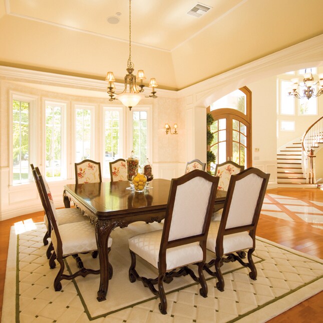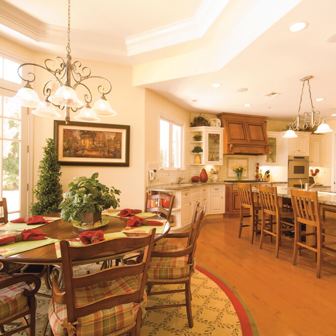 For formal meals, the family gathers in the dining room around the square mahogany dining table, which seats up to 20 for special-occasion dining. The togetherness is enhanced by the dining room’s paneled walls and the custom brushed nickel light fixture, which casts a warm glow over the feast.