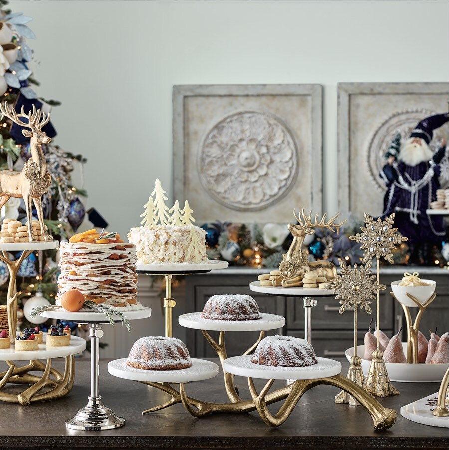 Whether you’re hiring a caterer or recruiting the kids to help, the right serveware presents holiday feasts with convenience and class. Our marble-topped Antler and Abbey serveware collections elevate your presentation, and the Abbey heights are adjustable for creating a dynamic display. Keep the mingling at cocktail hour going with our Optima Beverage Collection, Weston Wine Caddy and Amelie 3-Tier Server.