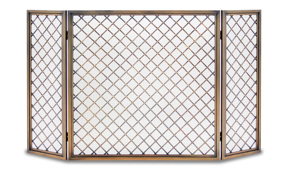 Fine craftsmanship takes center stage in the clean and precise grid work that makes up this stately fireplace screen. Each piece is handcrafted from stainless steel and finished with antiqued brass or a contemporary polished nickel with a protective mesh backing.