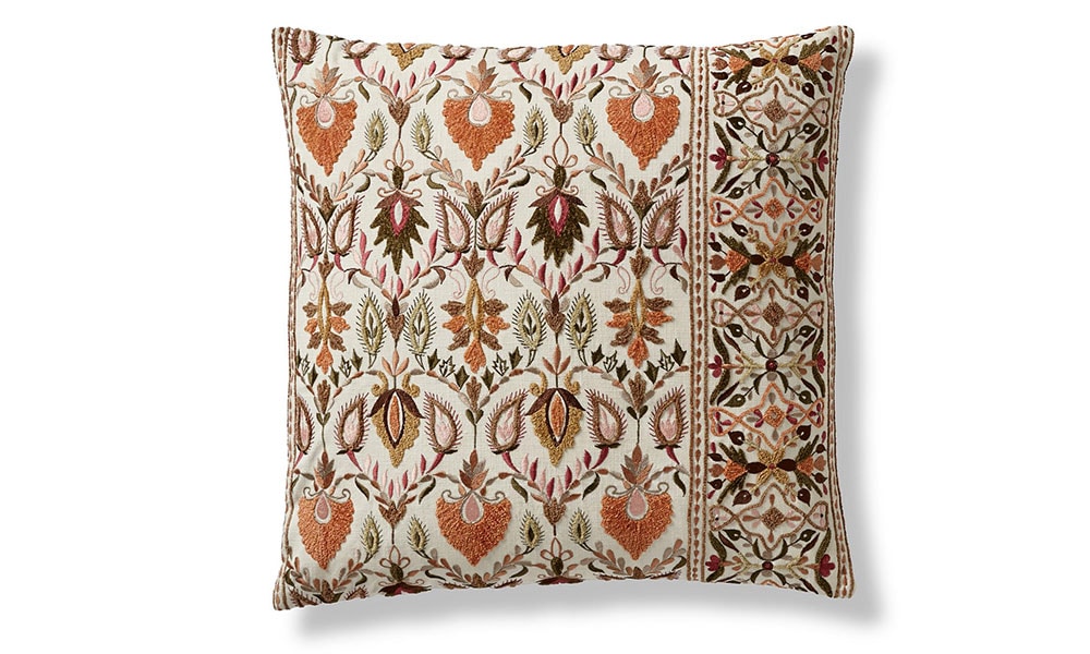 Earth tones of russet, moss green and burnt orange thread are hand-embroidered on cotton-linen by skilled artisans in India to create this show-stopping throw pillow. It’s an easy way to bring texture and inspired detailing to your indoor decor.