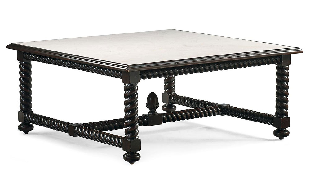 Skillfully crafted from solid mahogany with an inlaid travertine top, our Tobago Cocktail Table receives unique decorative touches with a warmth that can only be achieved by handcarving. The careful attention of a master carver fashions the acorn finial that sits at the center of the stretcher between the table’s winding spiral legs.