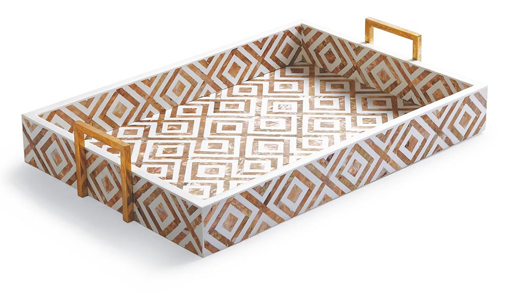 Iridescent penshells meet clean-lined brass on these globally inspired trays and boxes. Each piece of old rose-hued penshell is precisely cut and hand-laid in white resin on wood resulting in a piece that is both beautiful and functional.