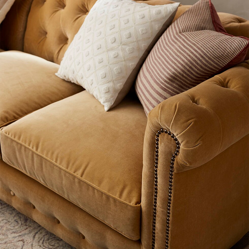Our supple, top-grain leathers are hand-tanned, then aniline-dyed for consistent coloration. If you prefer fabrics, we stock hand-tailored velvets, flax linens and more, all with a fine hand. On tufted sofas such as Barrow, Wendover and Sorrento, we sew the material into a pattern to give it a pronounced tuft, and then finish it with buttons. All nailheads are carefully hand-hammered, while competitors often use connected strips (with few actual nails) that are only lightly tacked.