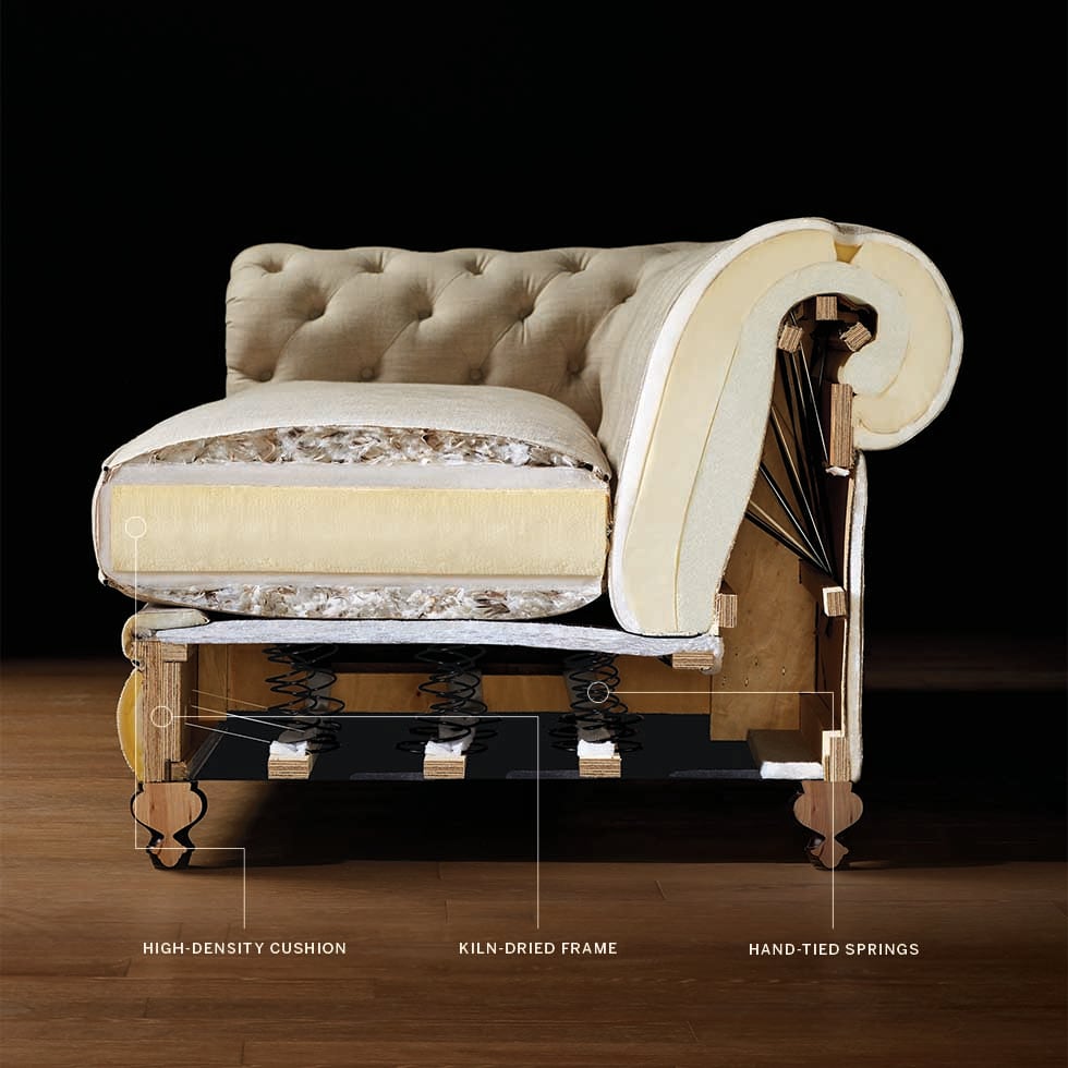 We start with a strong suspension system, always employing either eight-way hand-tied coils or sinuous springs to ensure seating comfort while creating stability that keeps springs from shifting. Meaning your sofa won’t be sagging in spots after a few years.