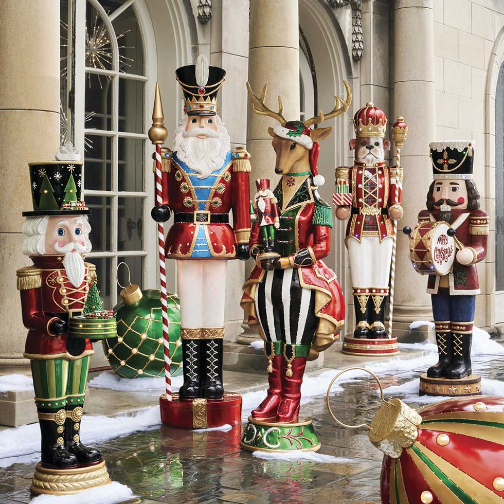Equally at home indoors or outside, this 9-foot-tall giant nutcracker is hand finished with metallic paints and outfitted with 50 colorful LED lights so it looks amazing day or night. The whimsical quality embraces the magic of the season, making this the perfect holiday photo backdrop.