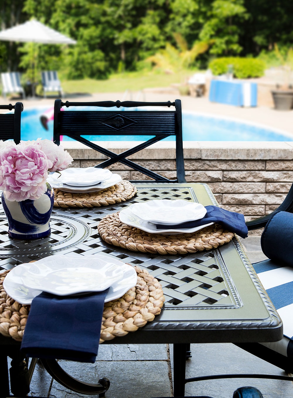“There is nothing worse than a broken glass around a pool. These melamine ruffle plates and plastic stemware are pretty and indestructible!”