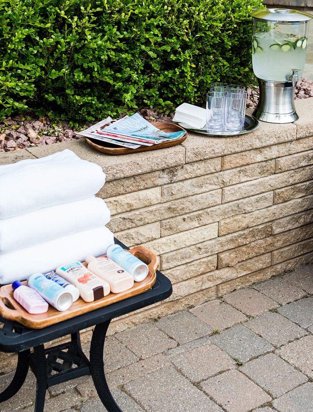 “Extra towels, water and sunscreen are must-haves. I create a “station” so guests can easily access all of these items. Infusing the water with berries makes it more tempting for little ones to stay hydrated! Some sort of mosquito control – citronella candles, sprays or bug zappers – will keep your guests from worrying about bites.”