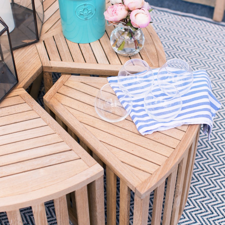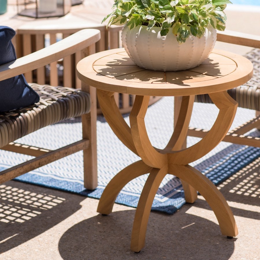 For every recommendation, Ginter considered how the piece would truly function. For example, the slatted teak design of the dining chairs and the open weave of the Isola seating allow for quick drying following pool parties or afternoon rain showers. Ample end tables mean a grandchild always has a place to set a drink or treat, and the circular Pasadena Teak Coffee Table provides additional options, as two detachable wedges can function as individual tables.