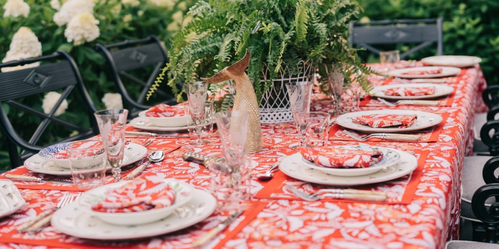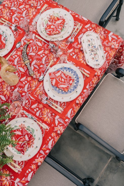 JA: When summer transitions to fall, I love to incorporate deeper, richer colors. Our Rouge Chintz tablecloth evokes warmth and an impending season of cozy indoor meals. The palette is inspired by worn Turkish carpets, old books, pipe tobacco and cozy fall evenings.