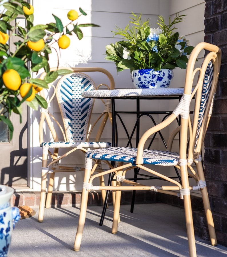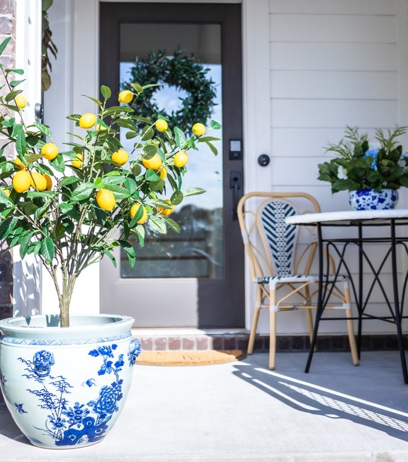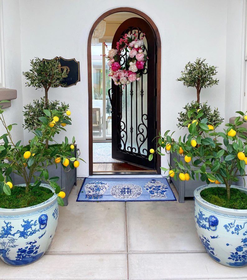 Lush Olive Leaf Wreath, Blue Ming Ceramic Handpainted Planters, Keller Bistro Chairs, Outdoor Lemon Potted Tree and Sunburst Half-round Coco Door Mat, as styled by @lushtoblush (images by @ryanaaronphotography)