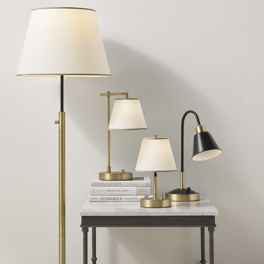 At home in virtually any space, floor lamps add height and character to any room. They perfectly illuminate corners, entryways and even large living rooms. This lamp type directs light in a variety of ways. Some cast light downward, others upward, and some move directionally to increase visibility where needed. Floor lamps pair well with other light sources to give a brighter effect. When choosing your floor lamp, be sure to consider the height and width of your space. If your ceiling is low, choose a floor lamp on the shorter side so it doesn’t feel out of place. Conversely, if you have high ceilings, opting for a taller floor lamp will help your lamp blend with the layout of the room.
