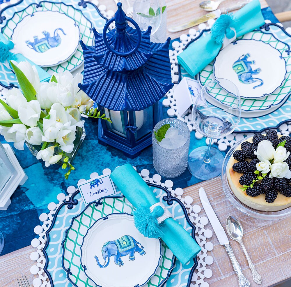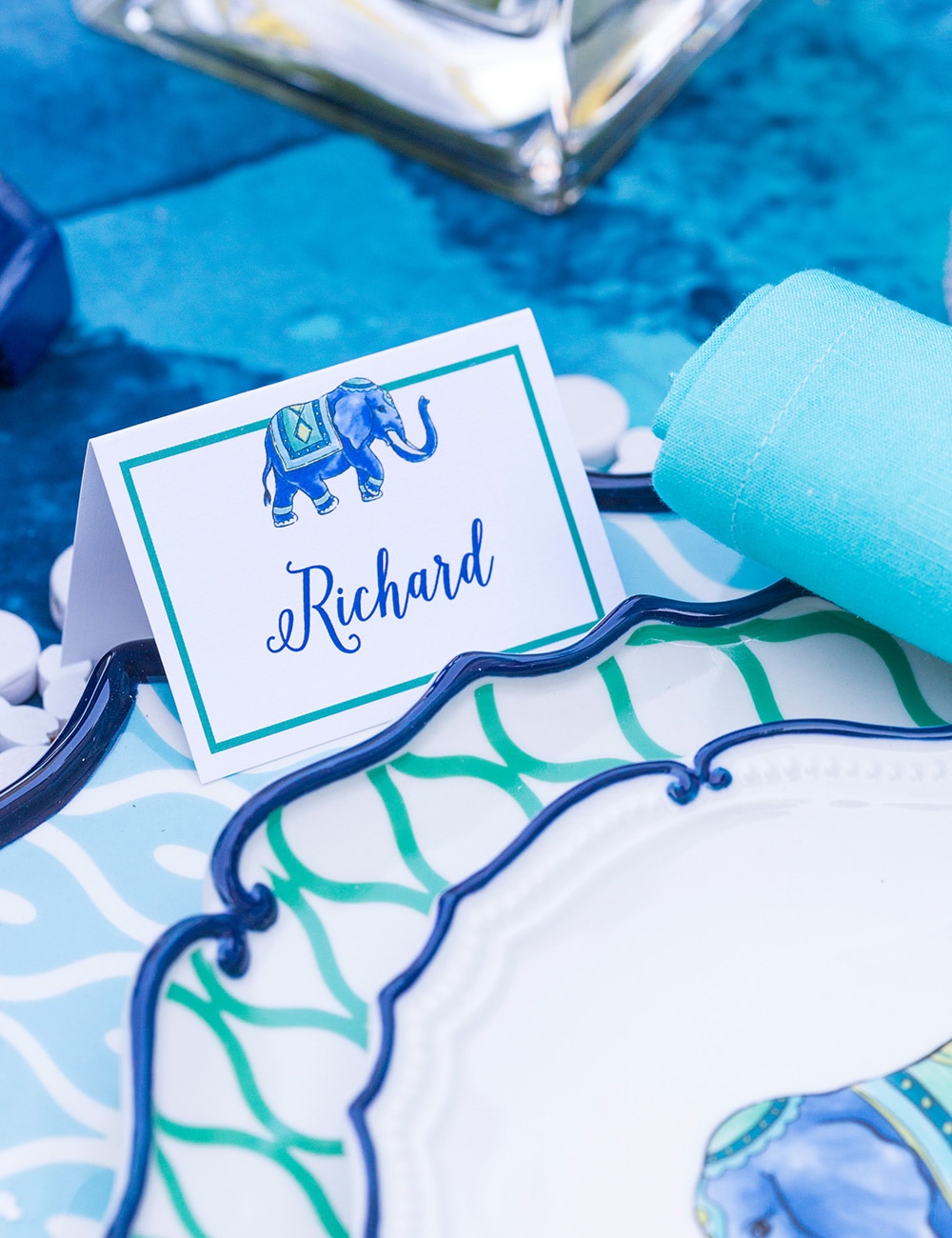 “Adding a personalized touch is my favorite way to make the dinner feel special. One of my favorite party tips is customizing place cards to coordinate with the decor. For example, I took the photo of the Elephant Appetizer Plates, and isolated the elephant graphic for my place cards. Just trace around the elephant, save it as a separate file, and add names in a fun calligraphy font. Print on heavy, white cardstock and cut! You can recreate this idea for any design, pattern or graphic. You can also take it one step further by using the graphic to create favor tags, banners, menu cards or invitations.”