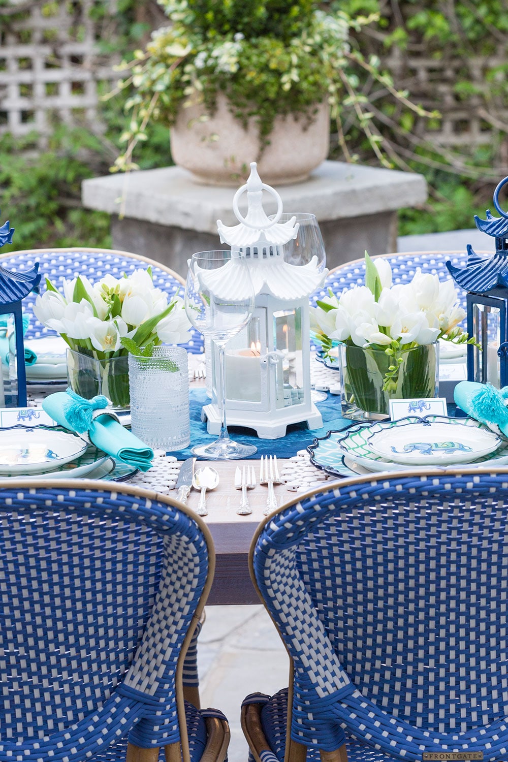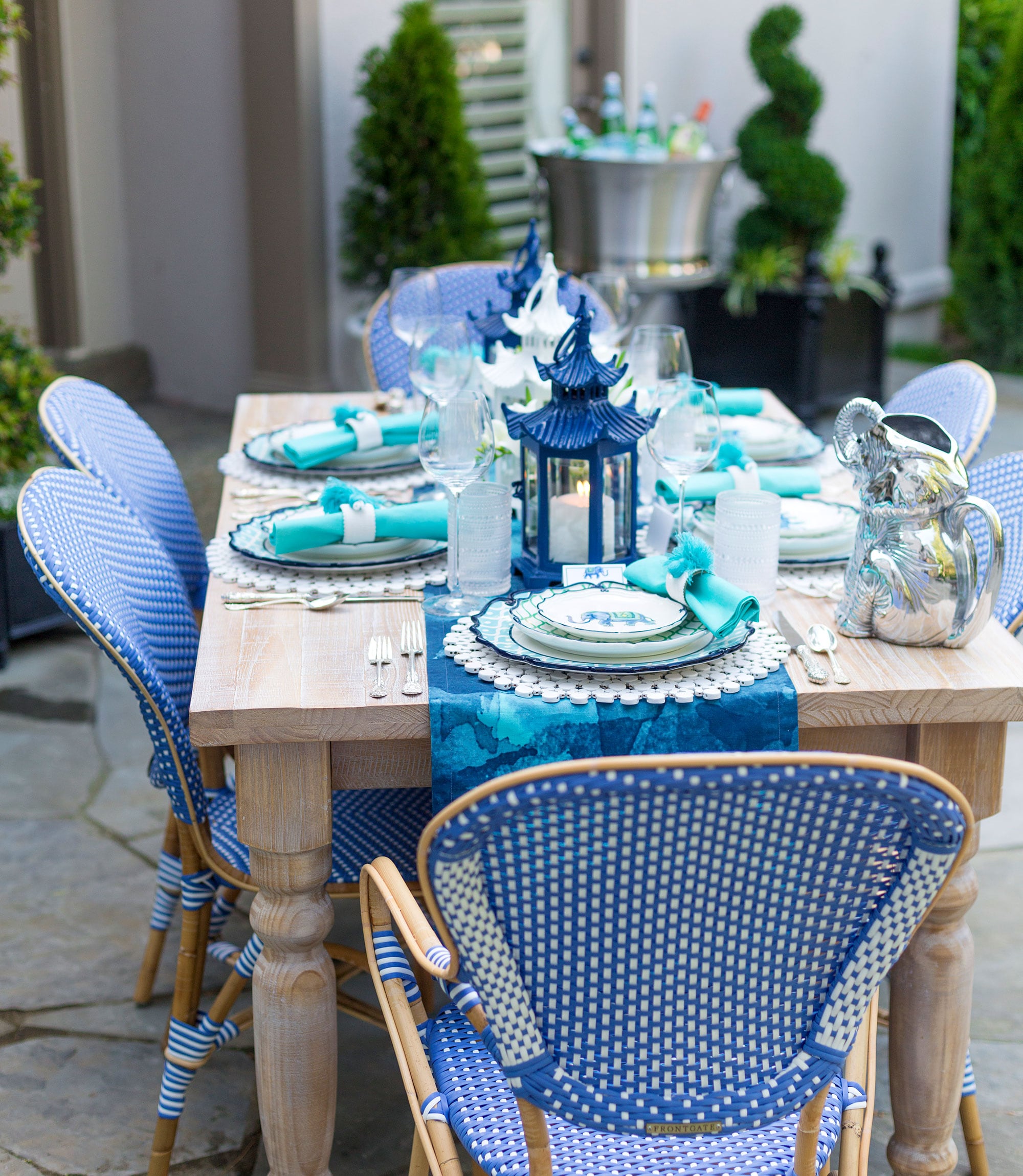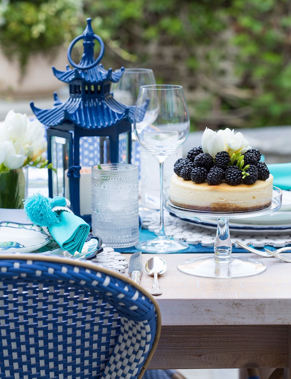 “To get started, I pull together dishes and decor on my indoor dining table for staging. Seeing the tablescape set allows me to see what I’m missing so I can make a quick shopping list. Then, on party day, I already have all my pieces together and simply take it outside. I also tend to stick to white, glass, or simple silver serving pieces so they’ll always coordinate. Several gorgeous lanterns in a couple of colors, like the Pagoda Lanterns, help bring ambience to the outdoor setting.”