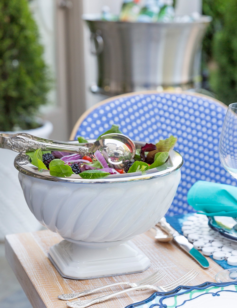 “Next I create a menu with as many oven-free dishes as possible so I’ll be able to spend more time with my guests and less time in the kitchen. Super Chill bowls really come in handy for this, especially for summer parties. Chilled salads and appetizers leave ample time to grill an entrée outside like barbecue-glazed salmon or steaks. As for drinks, I always like to serve a sparkling water with mint as well as wines and maybe a signature cocktail. Keep it easy – you don’t have to serve more than a couple of options. Lastly, beverage tubs pulled up by the party table mean you won’t have to spend your time getting up and down to refill drinks, so this is a must-have for me! At the actual party, I want my focus on keeping the conversation going so these pieces help me enjoy the party as well.”