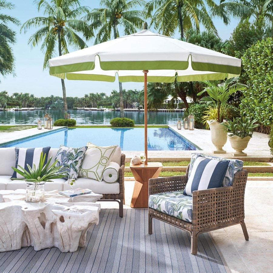 For making an outdoor area look and feel like a destination, what’s overhead is just as impactful as what’s underfoot. From a moderately sized designer canopy to a sweeping side-mount version that can shade an entire dinner party, a well-placed umbrella can provide welcome shade and send the message that this is a place to make yourself comfortable.