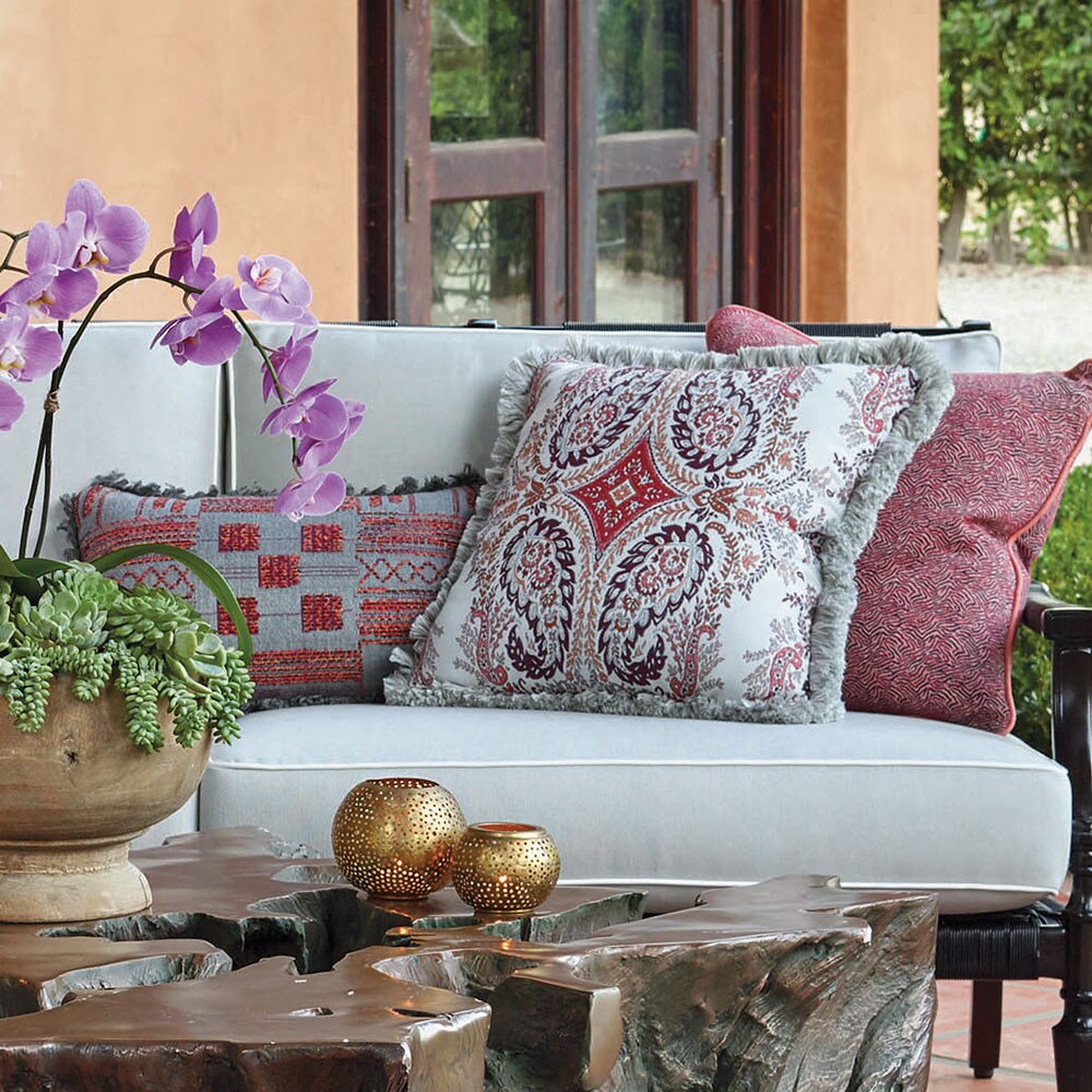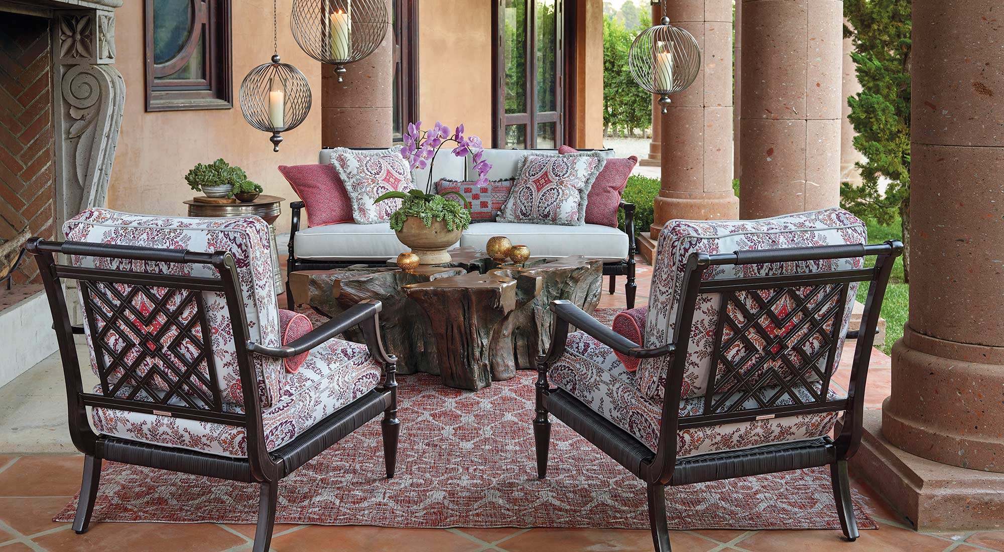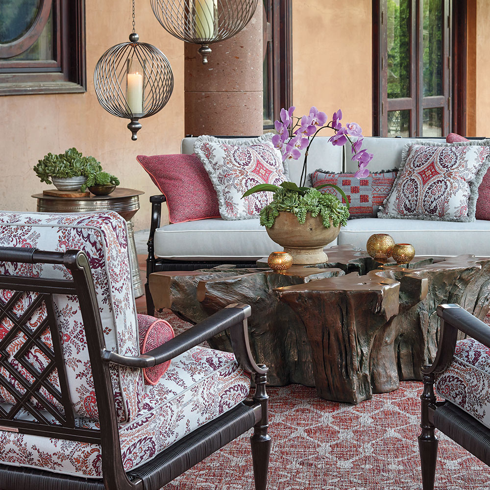 For a subtler approach, combine interesting textures, like the Montserrat Collection. The outdoor living room seen here finds its focal point in the Root Coffee Table. Resembling a cut tree root, it brings a natural beauty to the space that is further enhanced by textural vessels of different materials filled with plants and candles.