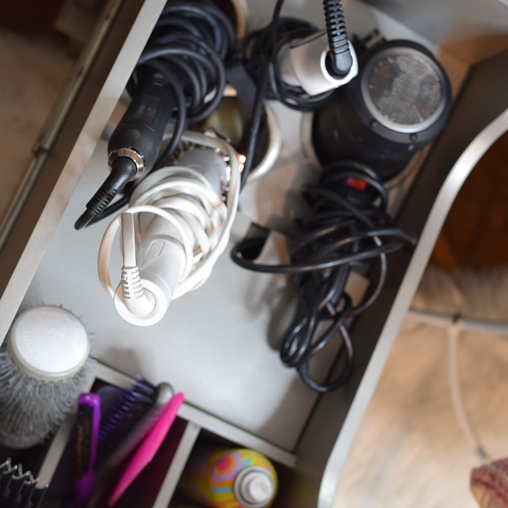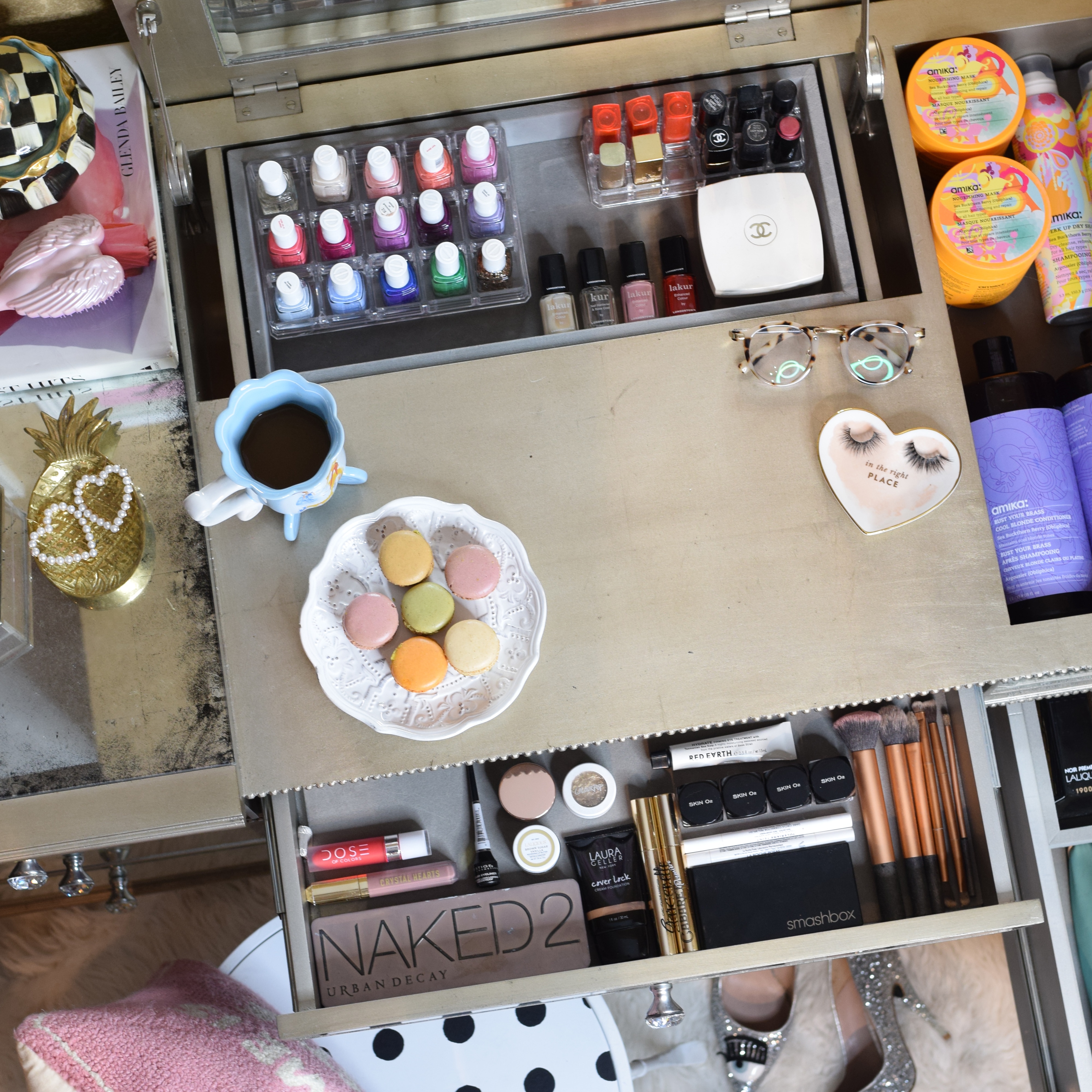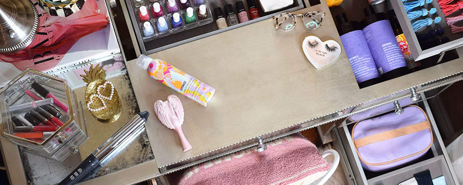 LV: As a blogger, my collection of makeup, beauty accessories and styling tools is constantly growing, so I need all the help I can get when it comes to organization. I love that the vanity has ample space for everything from my hairbrushes to my lipsticks and nail polishes. I can easily find the perfect spot for everything, and there’s even room for more!