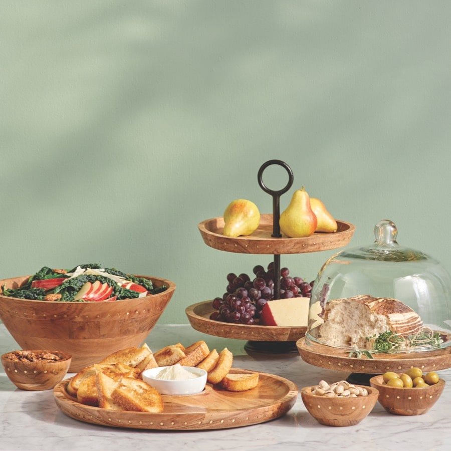 Each of the six pieces in our Teigen Wood & Rivet Serving Collection has potential for everyday use. Used together, the collection provides a cohesive, neutral base for a harvest, spring or summer tablescape. Separately, some items could be used to keep everyday kitchen essentials attractively stored within reach. While a small bowl might house sea salt near the stove or at the dinner table, the tiered server could hold a variety of fruits nearby. The silverware caddy could be used at the breakfast nook for quick and easy mornings, along with the serving stand filled with muffins or pastries. And for a more refined, less rustic kitchen, use our ceramic and iron Weston Serving Collection or Larkin Servers in a similar fashion.