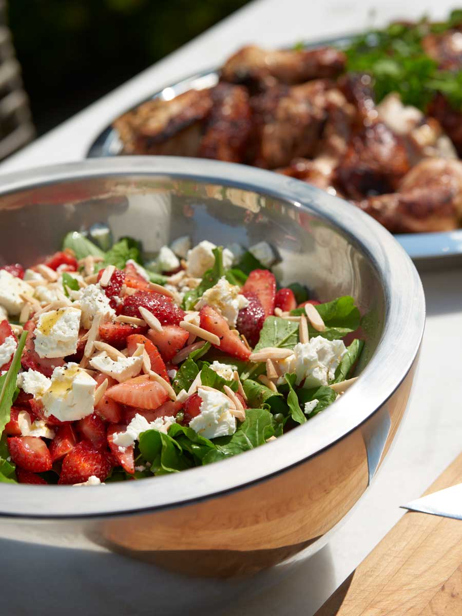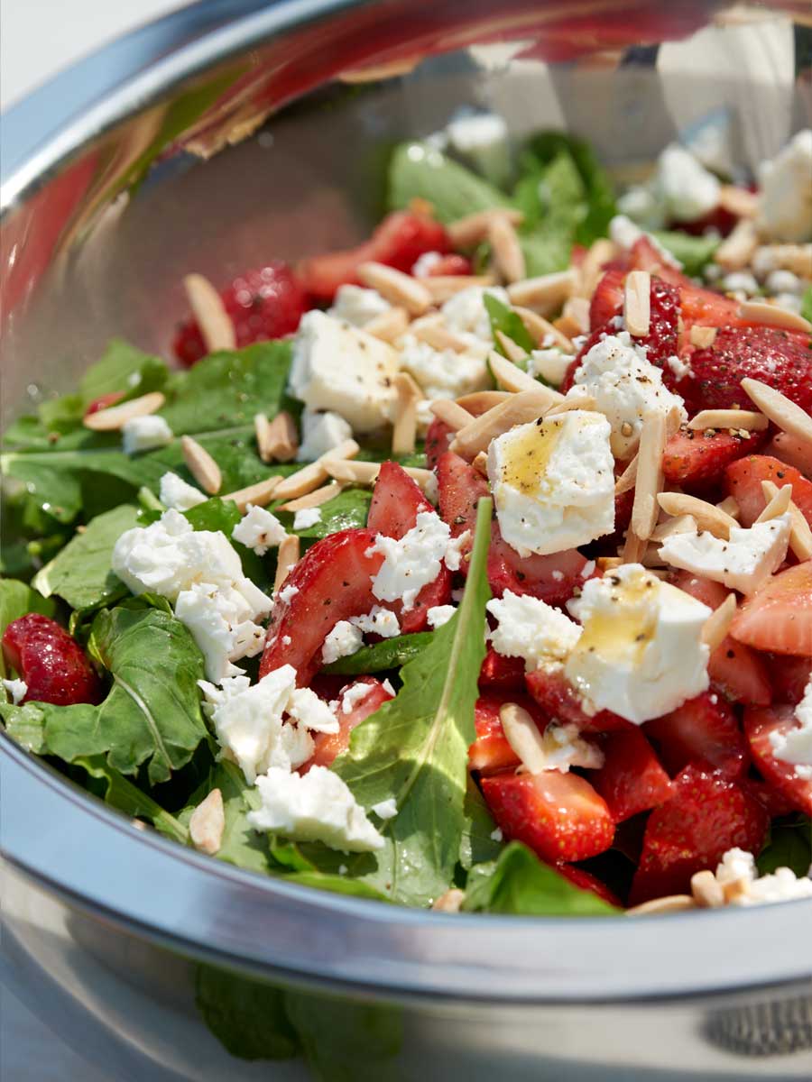 - In a large mixing bowl, whisk together the red wine vinegar, mustard and honey. Whisk in the olive oil. Season with salt and pepper. Add the strawberries, basil and toasted almonds. Toss to combine.