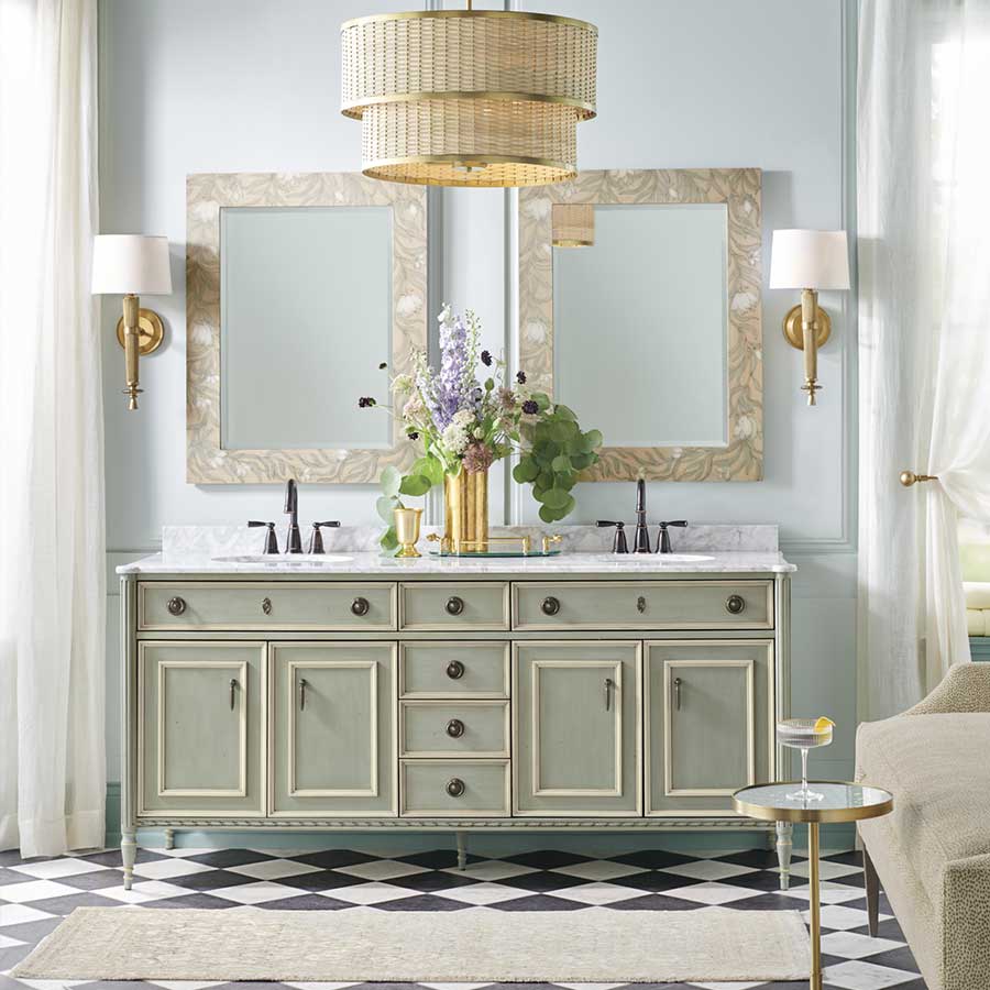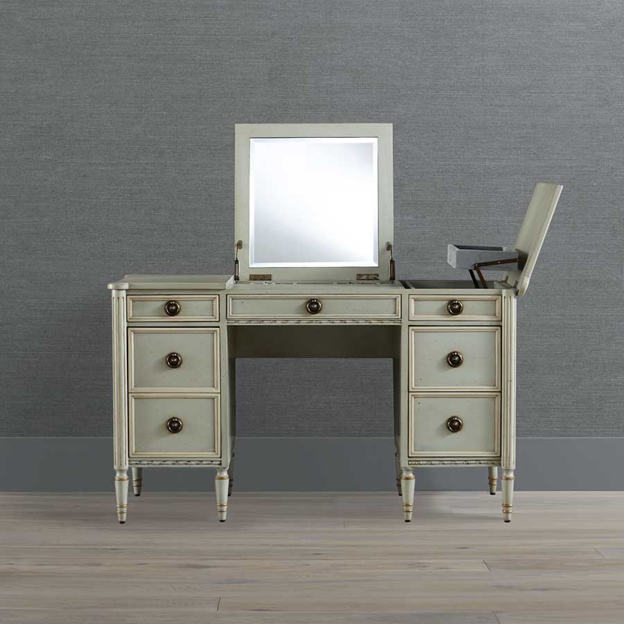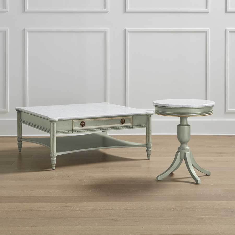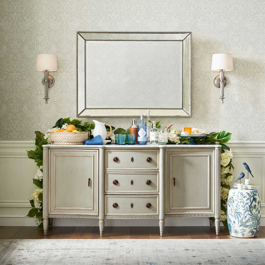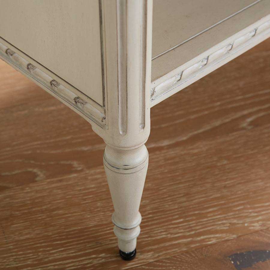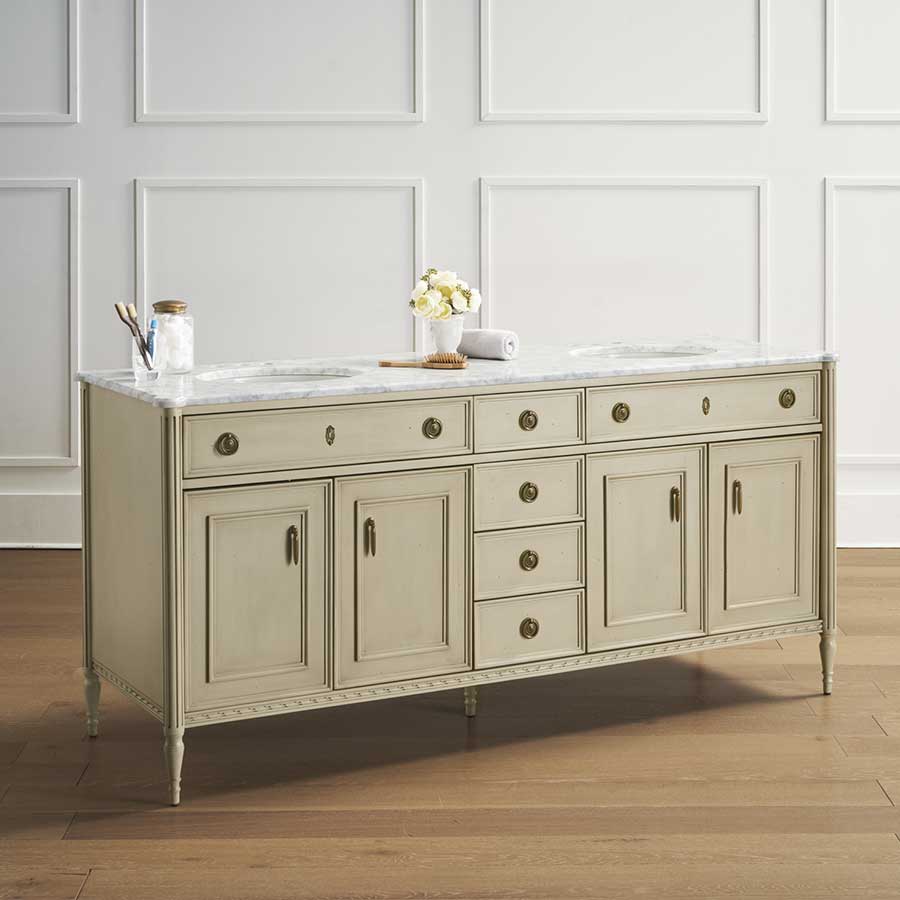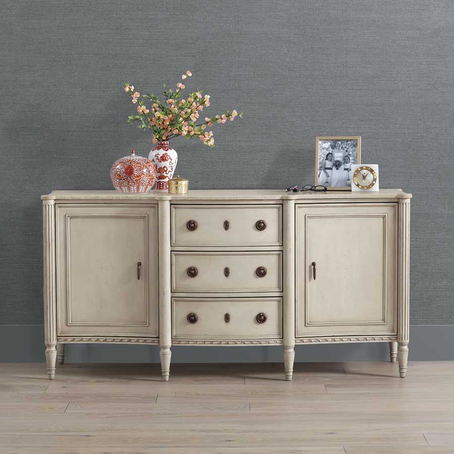 Inspiration: A picture of French allure, this collection conveys a romantic refinement inspired by the 18th century. A timeless design that will never go out of style, this antique-inspired collection features brass detailing, Crema Marfil marble, cast escutcheons and fluted column legs. These ornate elements, paired with the intricate wood detailing, accent each piece of the collection, providing a sophisticated focal point to any room in your home.
