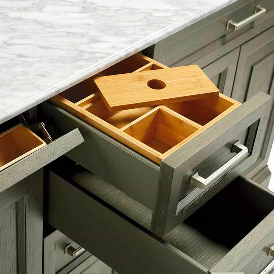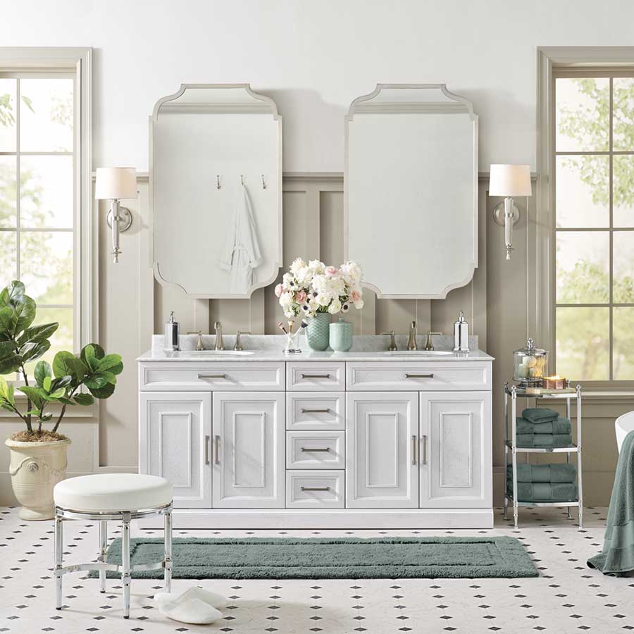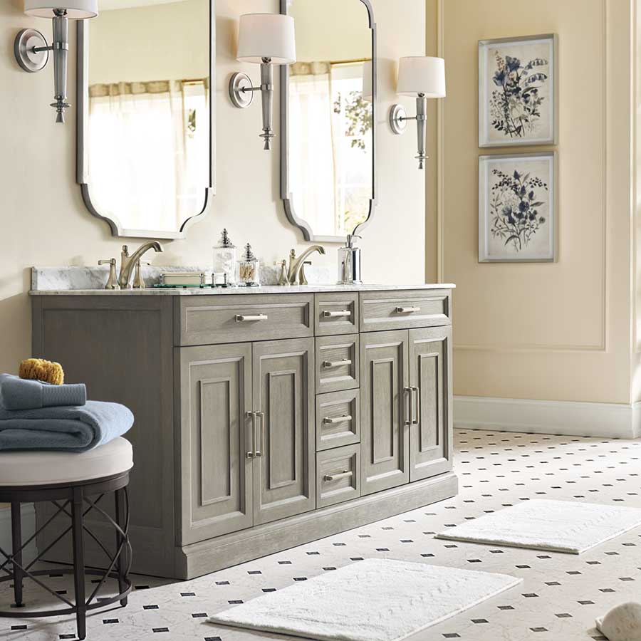 Extending into the bathroom, the Hunter Double Vanity has a sink basin and is pre-cut to accommodate a widespread faucet set over each wash basin. It has a flip-down drawer to hold brushes, toothpaste and other care items, two shelves behind the slow-close doors and four full-extension, slow-close drawers.