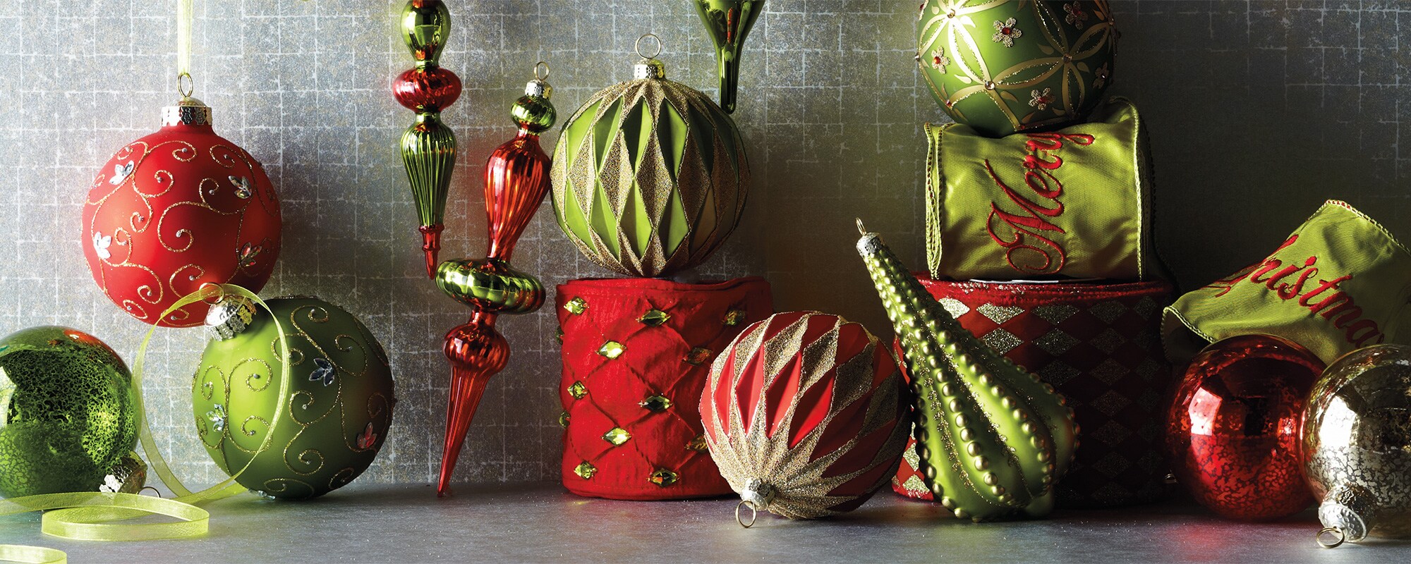 Pick out various styles of ornaments and trim from the same color family – such as shades of pink, hues of brown, gradations of white and cream – and concentrate them in one area. Use them solely on a tree. Place them in a clear bowls and vases. Hang them from greenery. If you have a few holes, use your filler item to help complete the look.