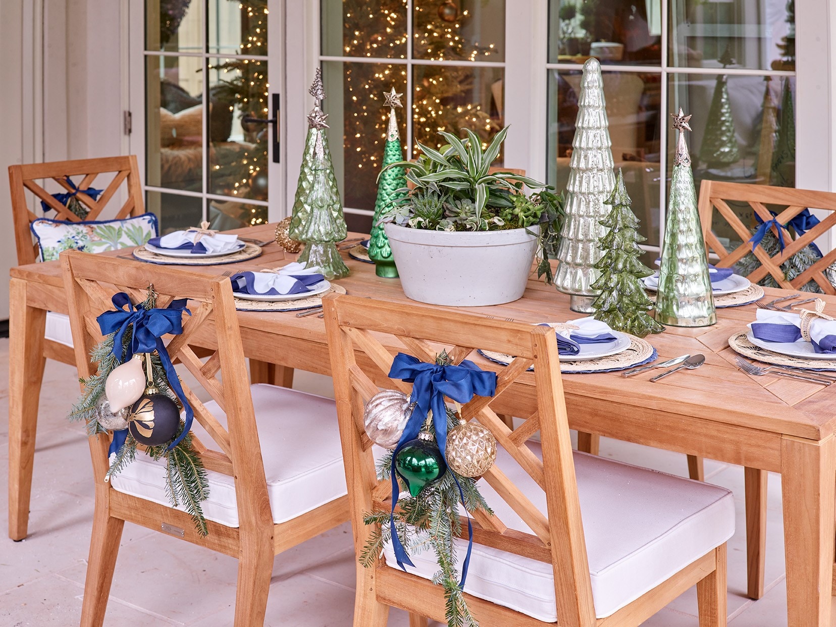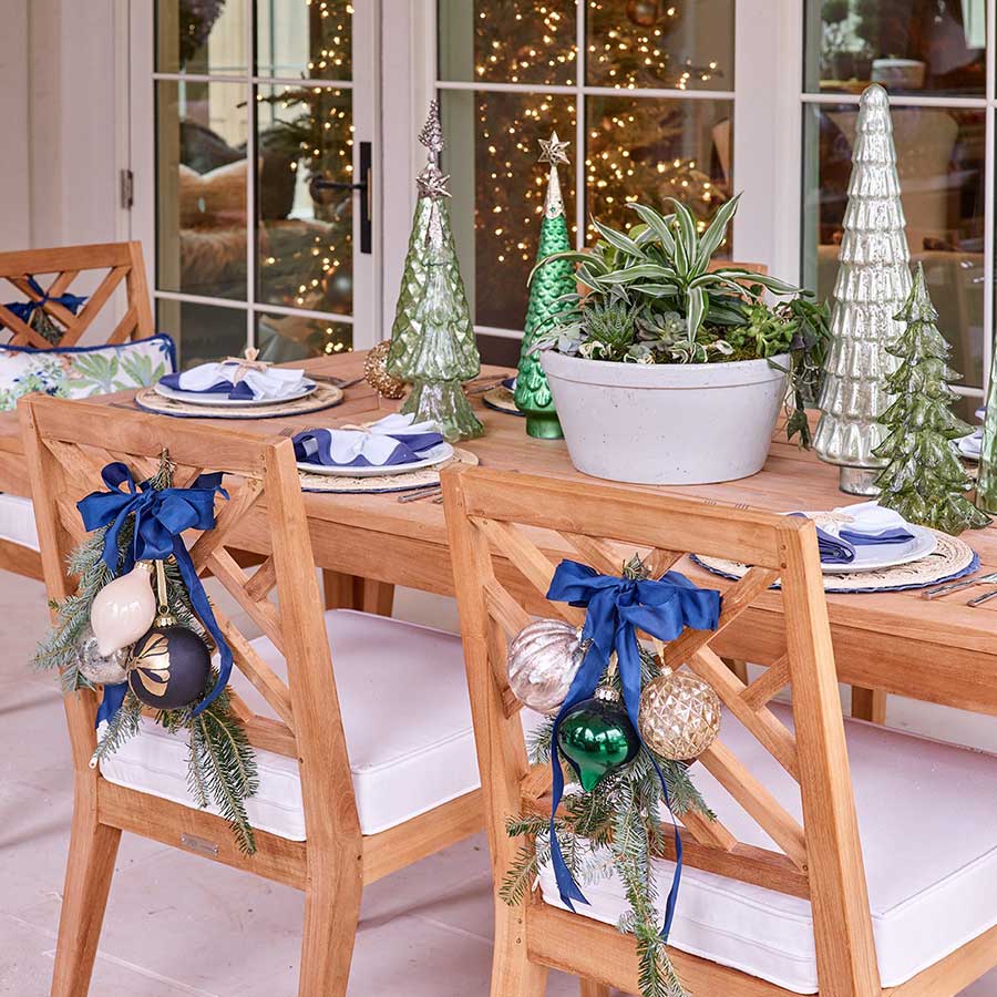 GP: The versatility of the pieces made them ideal for the outdoor space. I wanted to showcase the many ways they could be used. I say that the “Holy Trinity” of holiday decor is ribbon, greenery and ornaments – and each of these items used came from Frontgate.
