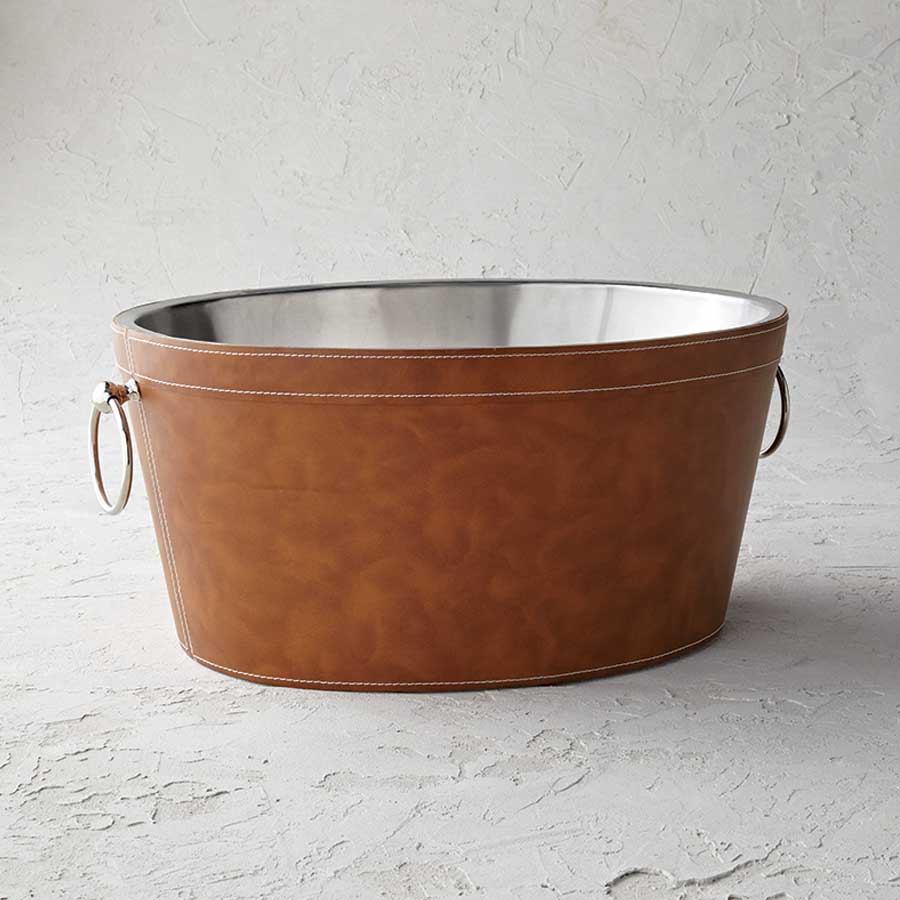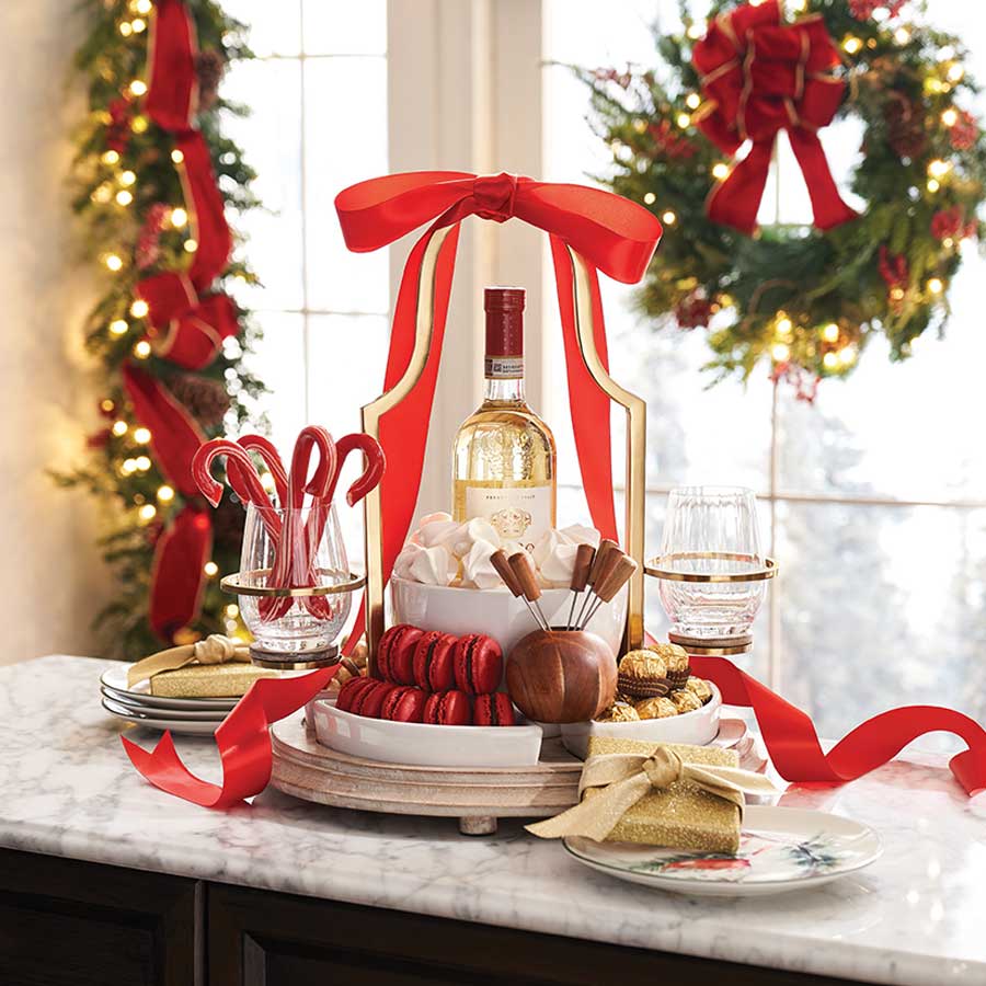 Bottoms up! Raise a glass to the ultimate hostess gift. A warmly curated collection of bar and entertaining accessories stuns in a leather beverage tub. Wrap it all up with a few bottles of wine, and don’t forget a festive, glittering bow!