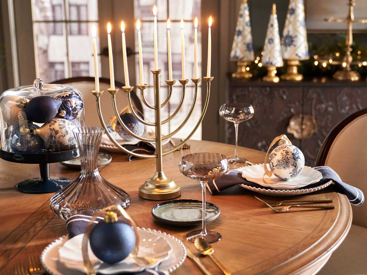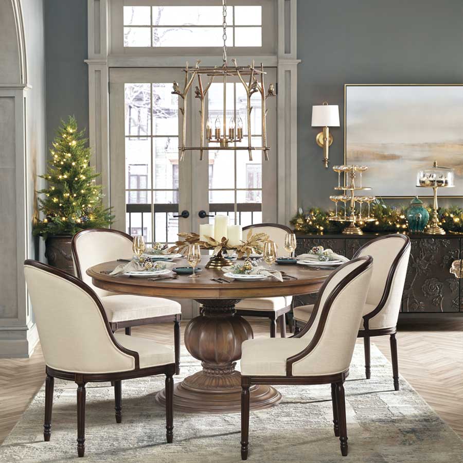 Statement lighting is having a moment. Equal parts function and art, chandeliers that perfectly anchor a dining room table can be a great way to set the stage. Consider metal pieces that bring in a hint of shimmer and can perfectly transition to feel like an additional layer of holiday decor. You can even have a little fun by layering in a handful of gold or silver ornaments to add another level of festive flair. When you are hanging a chandelier above a dining table, the bottom of the light should be ideally 32–34 inches above the tabletop so it does not block guest views and allows room for any table centerpiece.