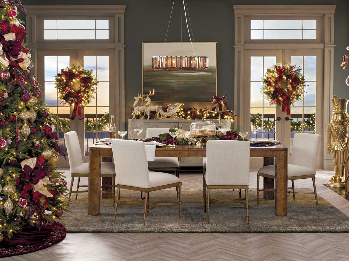 Don’t underestimate holiday decor to light your space. While Christmas trees are often added to embellish traditional living rooms, opting for a secondary tree in your dining space can provide a memorable focal point. If space is a concern, consider featuring pre-lit wreaths, garlands or even miniature trees, which can all be great alternatives.