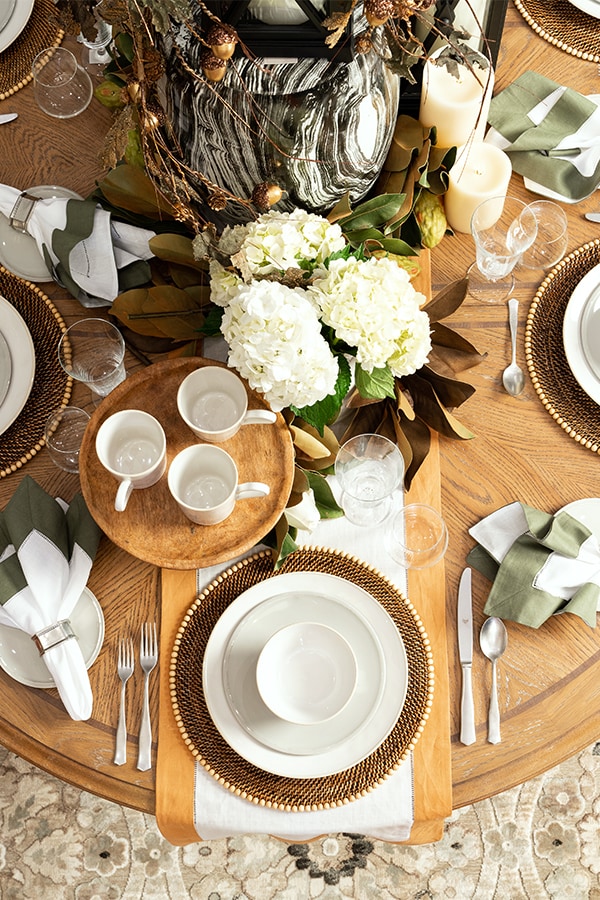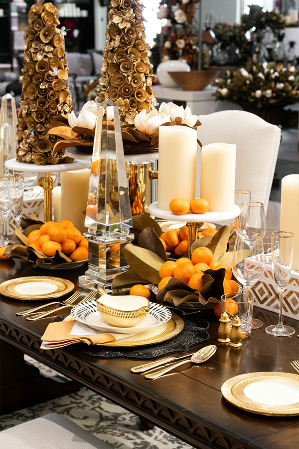 One thing no tablescape is complete without? A centerpiece. “Whether it is seasonally based, a floral arrangement, or candlesticks at varying heights, a centerpiece completes the entire look and theme of the table,” Denise says.