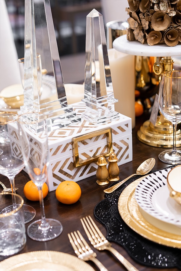 “When creating this glamorous table, I envisioned a festive holiday dinner party. In order to keep the table from feeling too fussy, I added fresh oranges to provide texture and color. I included the crystal obelisks and mother-of-pearl boxes to provide varying height, which also brought sparkle to the table, especially when reflected in the candlelight.”