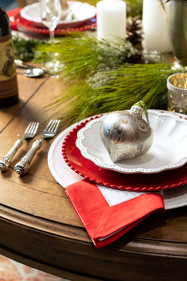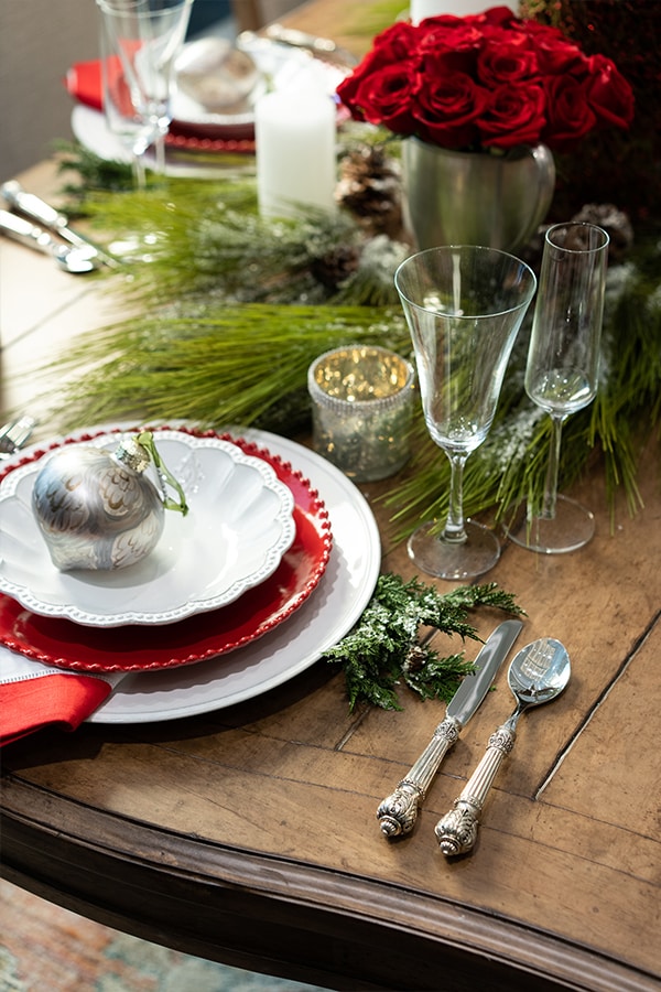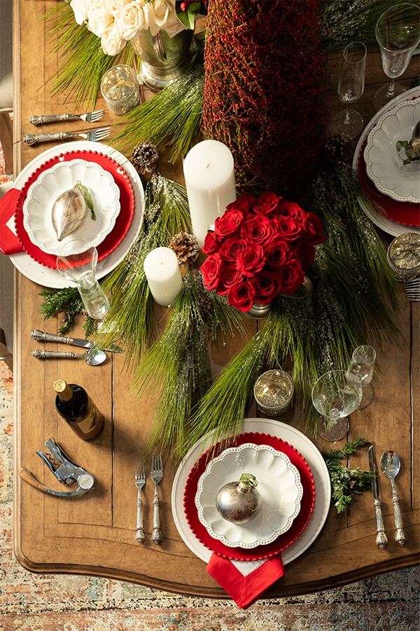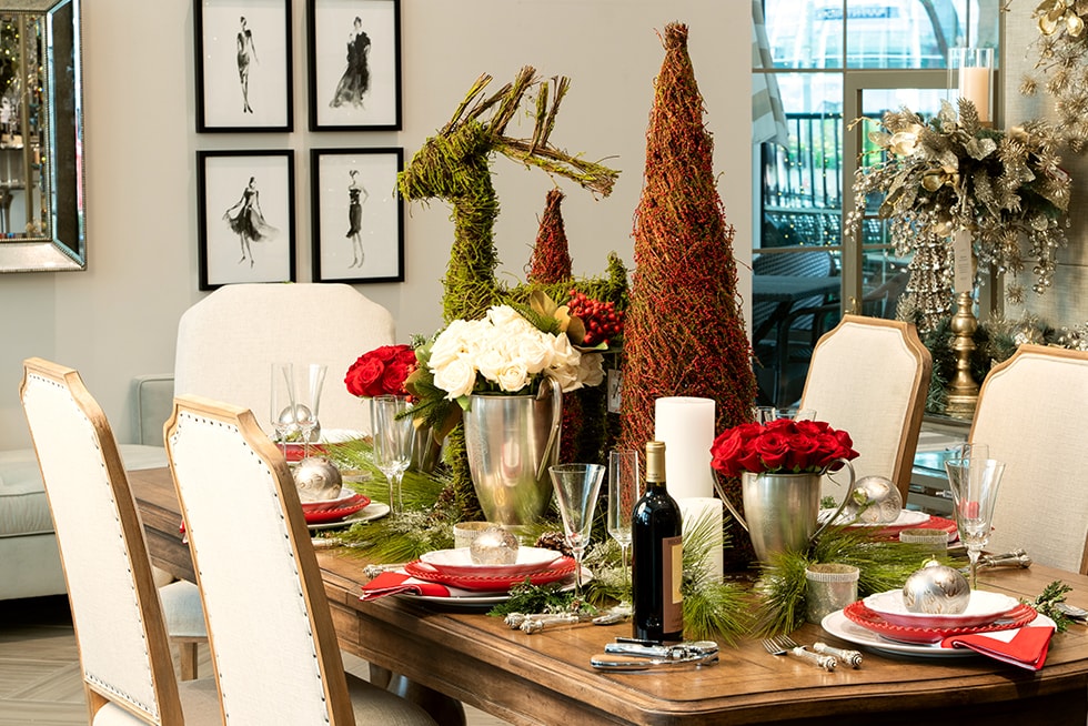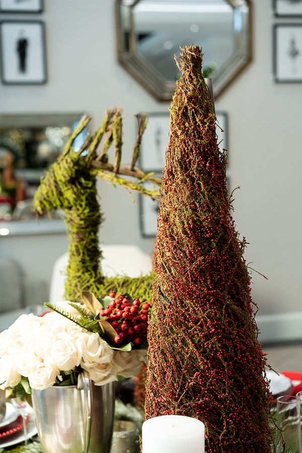 “Styling a dinner table setting using the classic holiday color palette of red and green is always en vogue. I started by layering pine garland with varying sizes of realistic evergreen trees, while moss reindeer provided differentiation in height. I tied everything together with fresh roses in trophy cup vessels and mirrored the look with red and white dinnerware accented with silver flatware and crystal glasses to complete the festive yet classic look.”