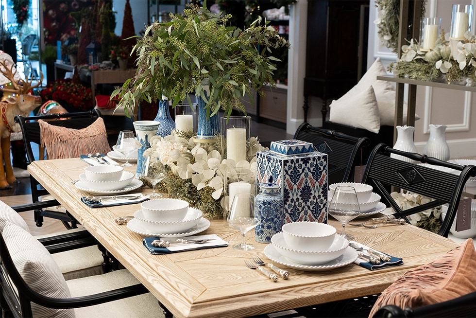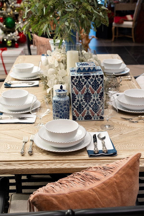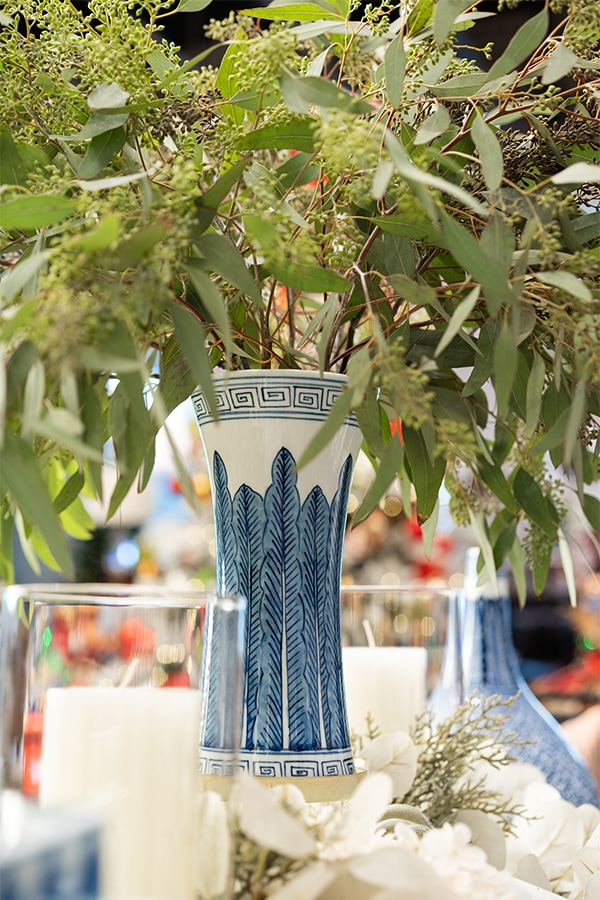 “For this outdoor table I wanted to create a casual feel with coastal influences. The Mooreland Heights Candle Holder Centerpiece is crafted from lifelike botanicals and foliage. I replaced the candle in the center with a vase of fresh eucalyptus to enhance the scent at the table. The look is completed with classic blue and white home decor accessories that can help create continuity throughout the space.”