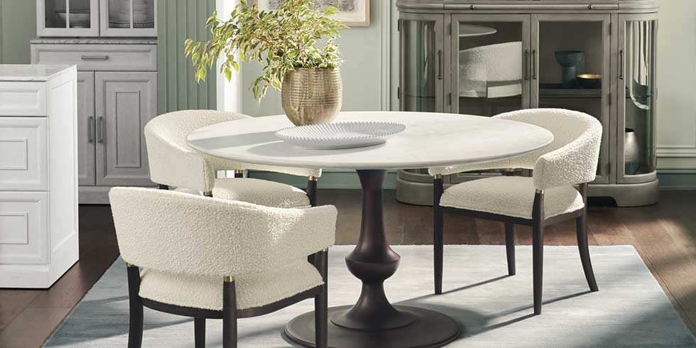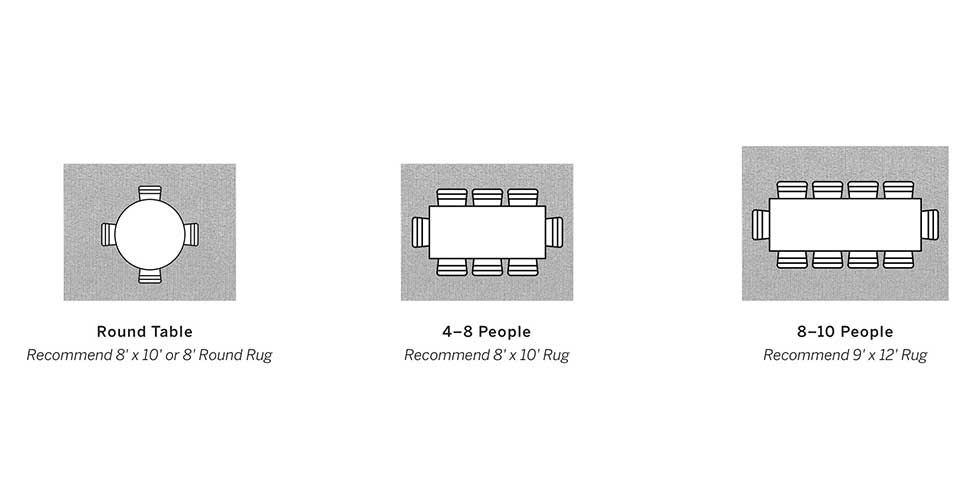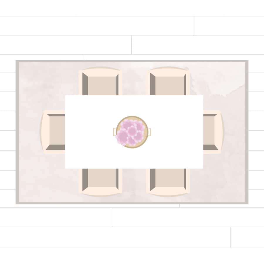 Whether you have a round, square or rectangular dining table, the shape of the rug should match. This helps keep the room feeling visually cohesive and fluid. This rug should be easy to vacuum (crumbs happen, after all) and also resistant to spills. In order to achieve the correct scale, make sure that there are at least 24 inches on each side of your dining table, so that when you pull out a dining chair, all of the legs sit comfortably on the rug.