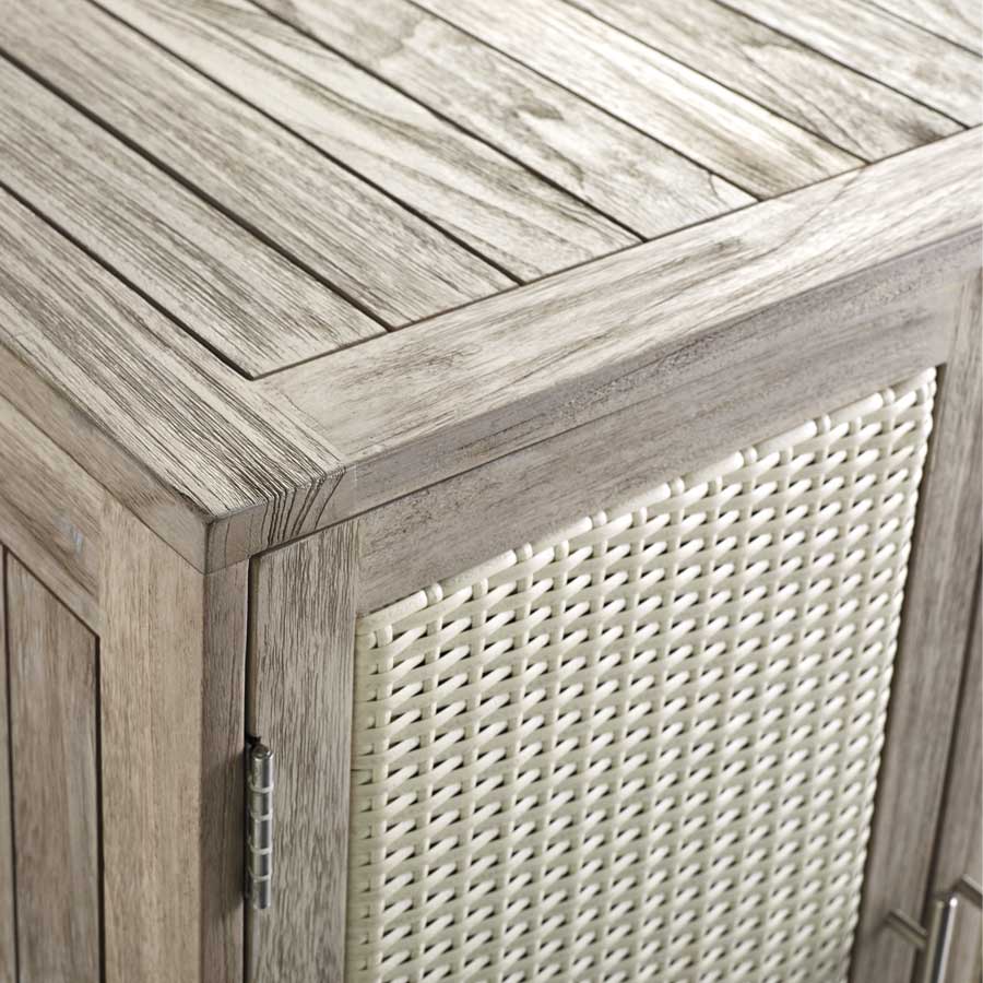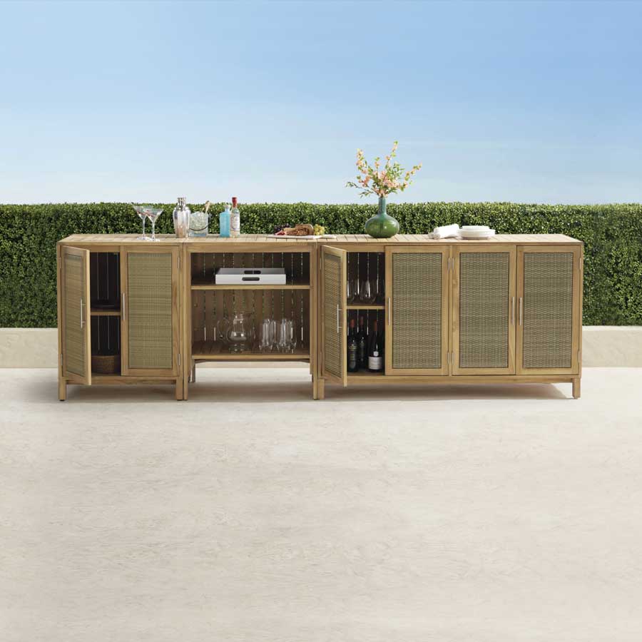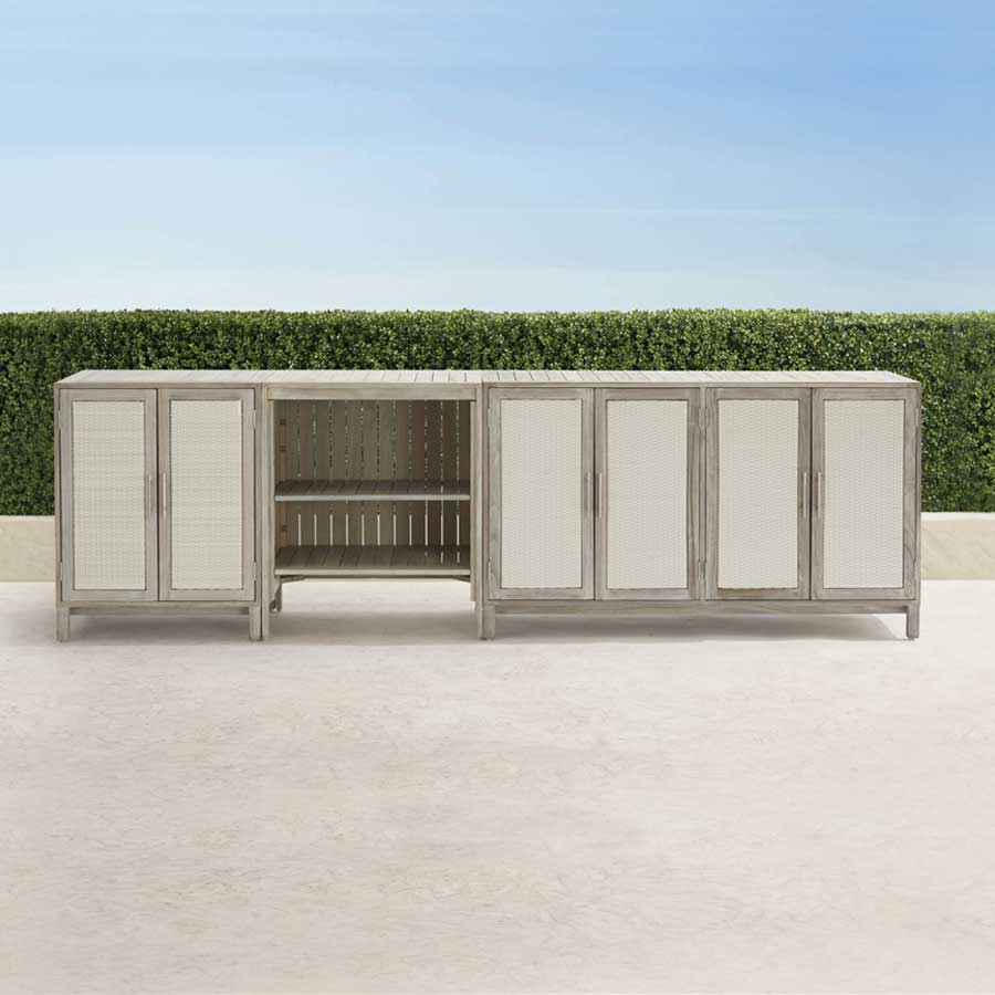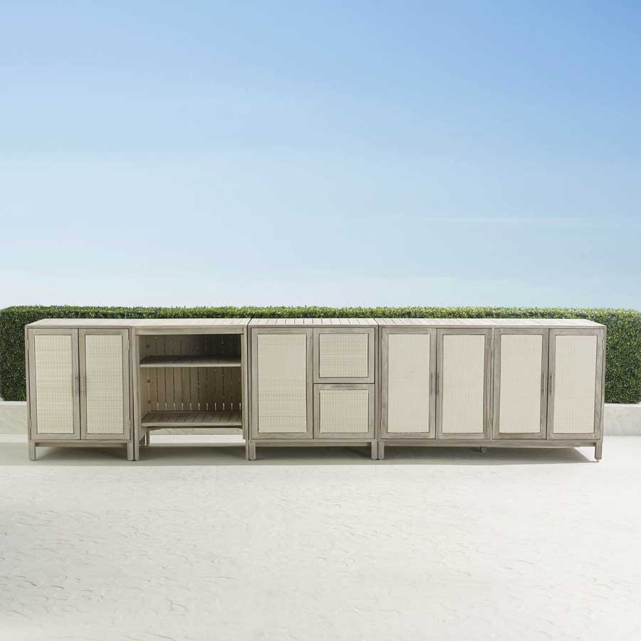 Additionally, the Isola Natural and Weathered Teak Kitchen Collection offers functional features such as removable shelves to accommodate a mini refrigerator as well as a drawer to house a trash bin. The Isola Console has a built-in stainless steel beverage tub and wheels at its base so you can relocate it as needed. The collection’s modular design means the pieces can be combined in a variety of configurations to suit your needs.
