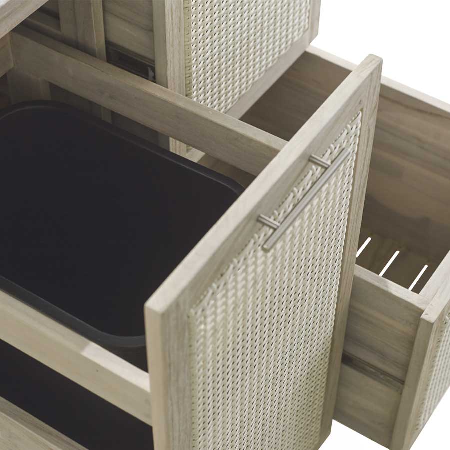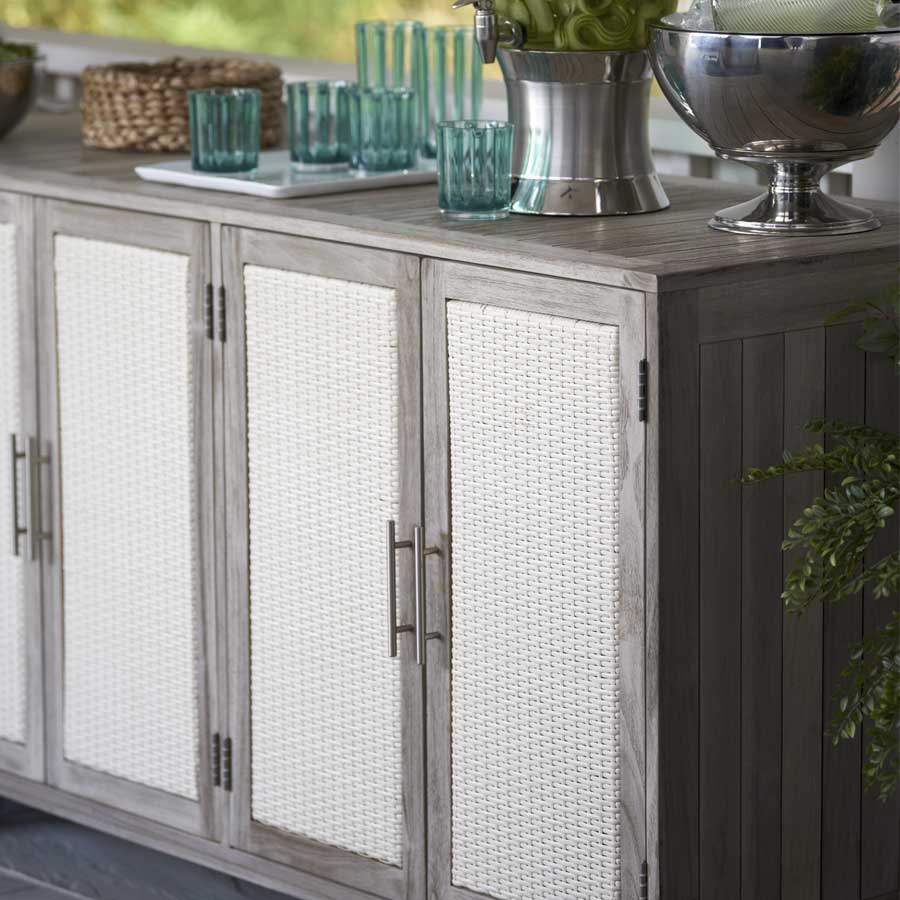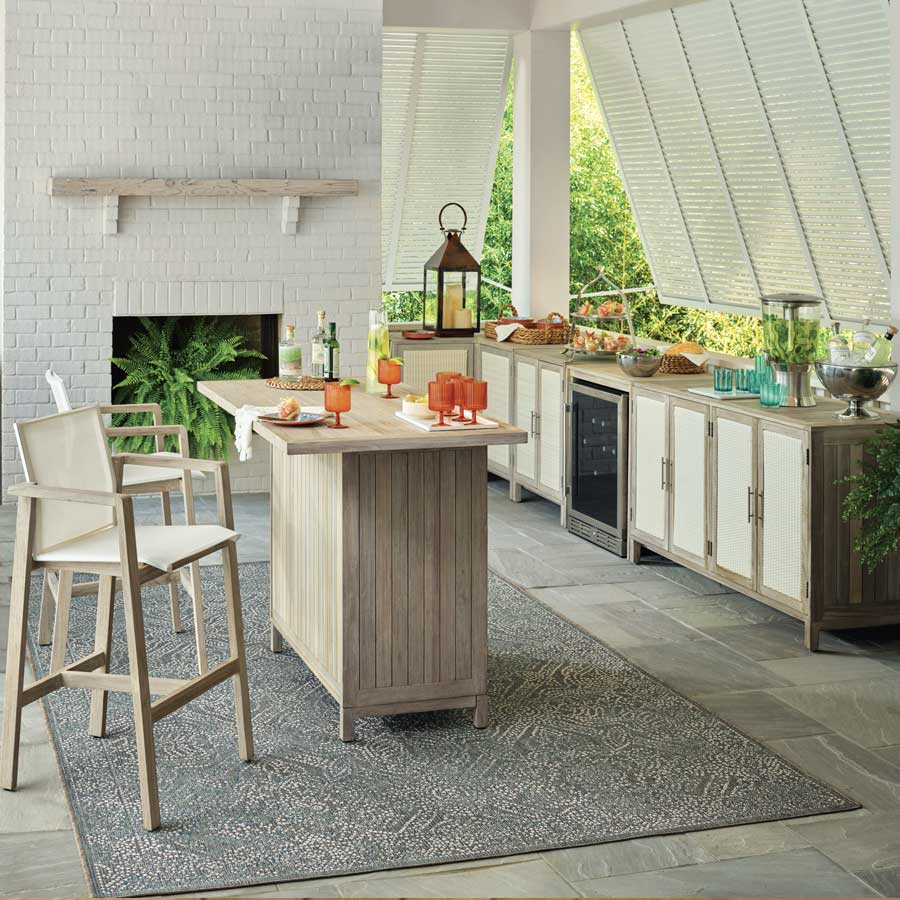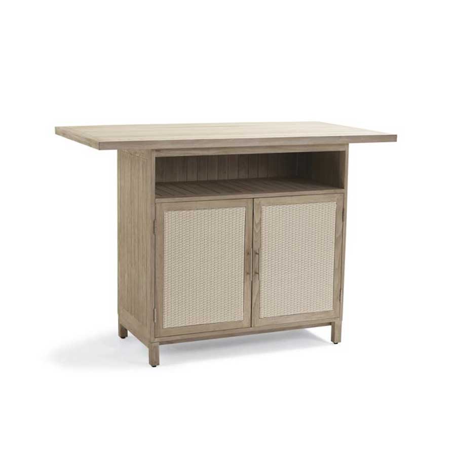Additionally, the Isola Natural and Weathered Teak Kitchen Collection offers functional features such as removable shelves to accommodate a mini refrigerator as well as a drawer to house a trash bin. The Isola Console has a built-in stainless steel beverage tub and wheels at its base so you can relocate it as needed. The collection’s modular design means the pieces can be combined in a variety of configurations to suit your needs.