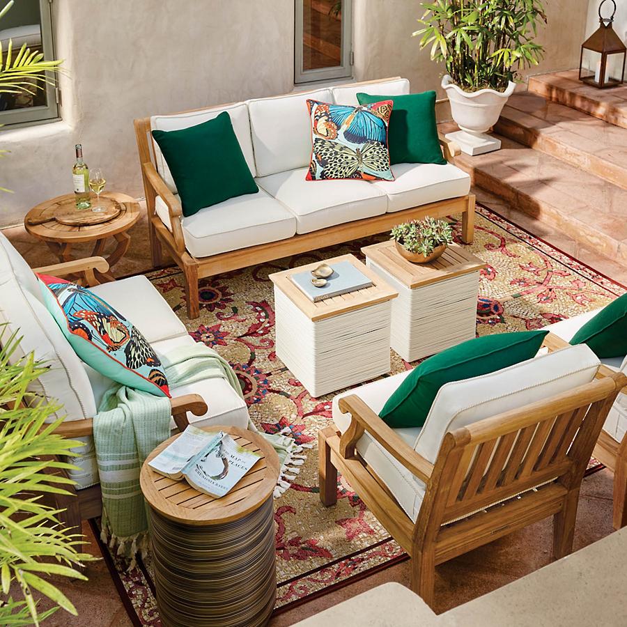 A rug will ground your space and make it feel more approachable – like a true outdoor living room. Our outdoor rugs will remain colorfast for years, and their durable construction makes them mold-, mildew- and weather-resistant, meaning they’re easy to care for. They can even be used indoors if you love the style.