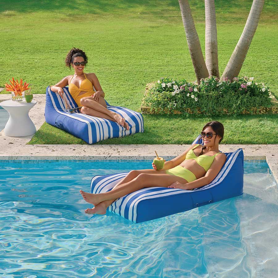 Crafted of 100% Sunbrella® fabric and filled with buoyant beads, this plush chaise functions as indoor or outdoor seating, as well as water-resistant pool float.