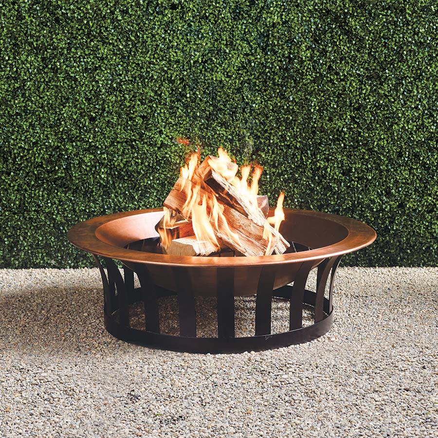 Constructed of durable outdoor, fireproof materials – typically metal, stone, fire bricks or concrete – fire pits sit on the ground or on a fire-safe surface such as stone, brick and concrete. Never place on a wood deck.