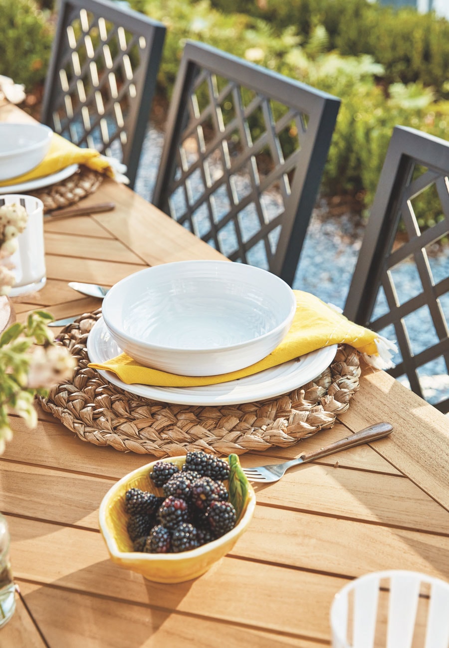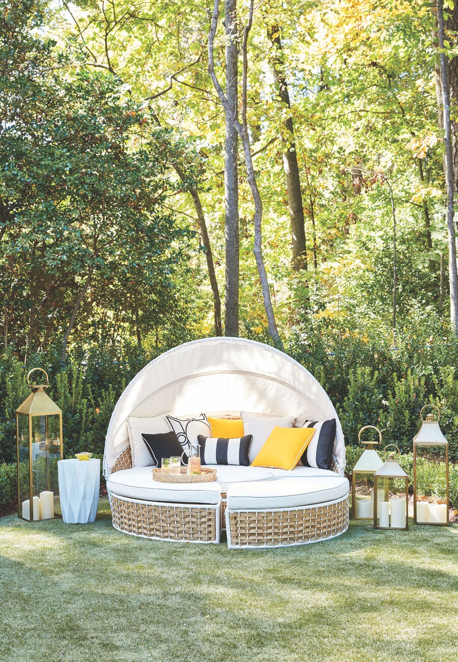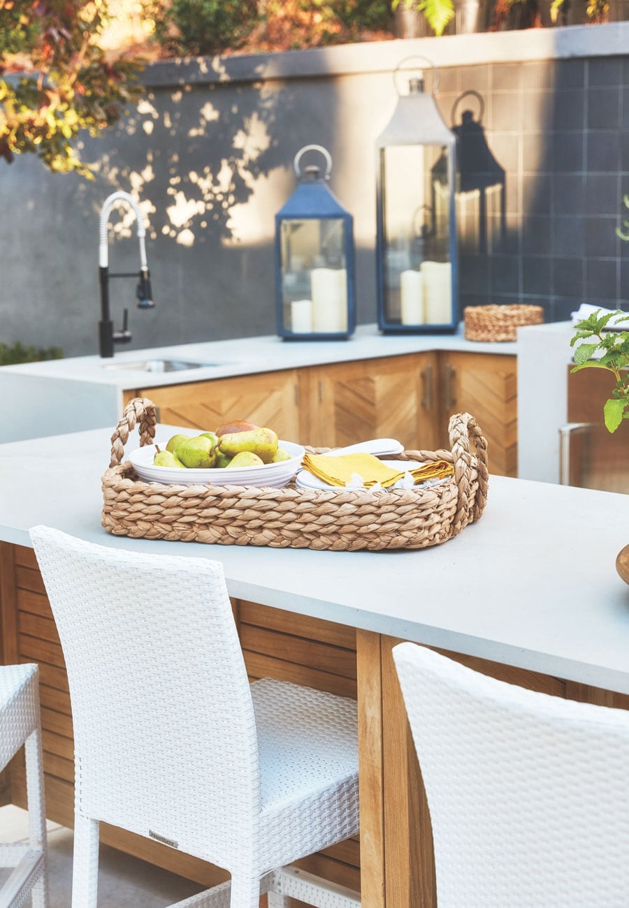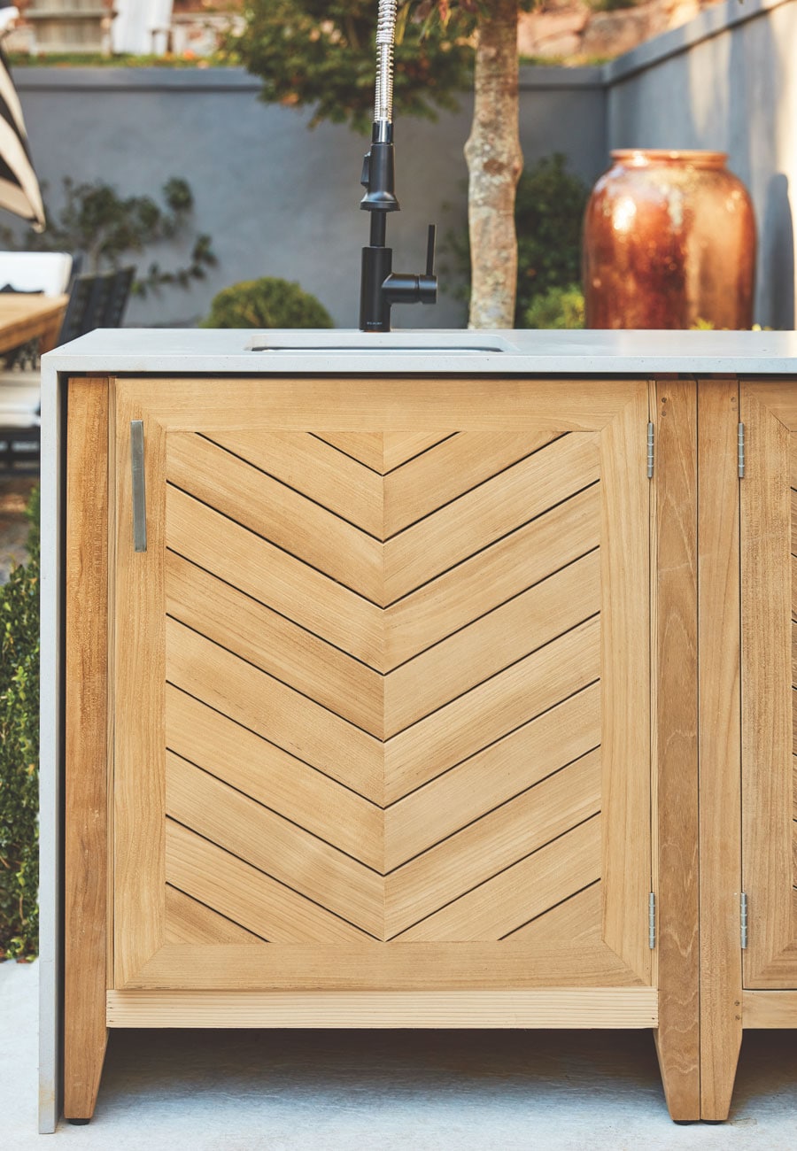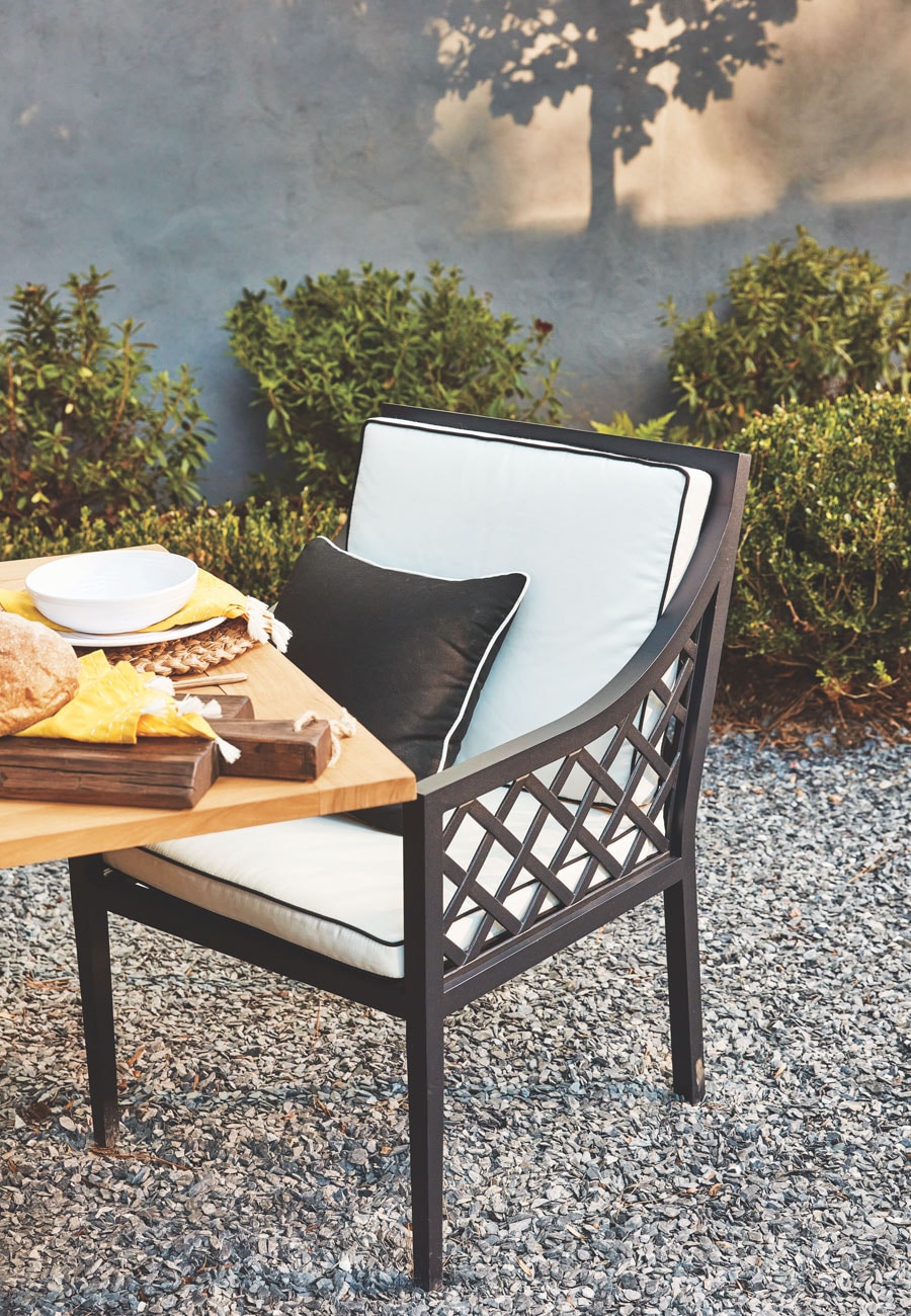 AG: Creating a functional and beautiful outdoor kitchen! I loved all the outdoor kitchen cabinet options with plenty of drawers and shelving to tuck away grilling tools, trash cans, outdoor dinnerware and other outdoor entertaining essentials. The flexibility to create a configuration tailored to any space really helped achieve this vision. My go-to for outdoor dining spaces is always comfort. Everyone tends to linger a bit longer when dining al fresco, and no one wants an uncomfortable chair breaking up the party.